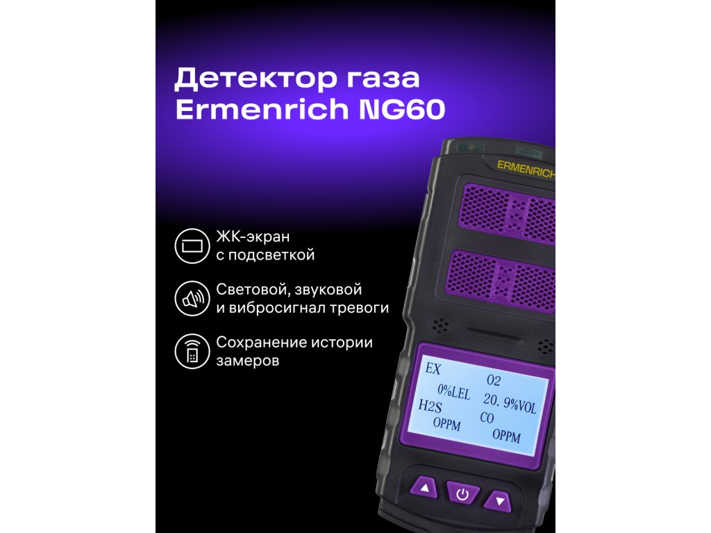 Detektor plynu Ermenrich NG60 je nezbytný pro stanovení koncentrace hořlavých plynů, sirovodíku a kyslíku ve vzduchu a pro zajištění bezpečnosti při práci nebo doma. V závislosti na typu plynu přístroj měří jeho koncentraci v % LEL (Lower Explosive Limit, spodní mez výbušnosti), ppm nebo VOL. Hodnoty alarmu lze nastavit ručně.