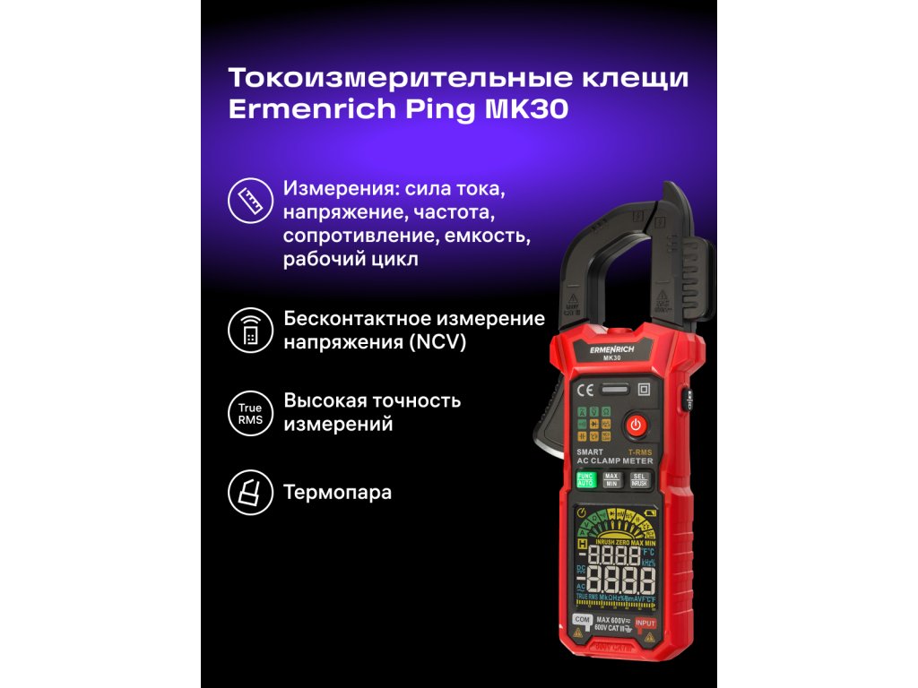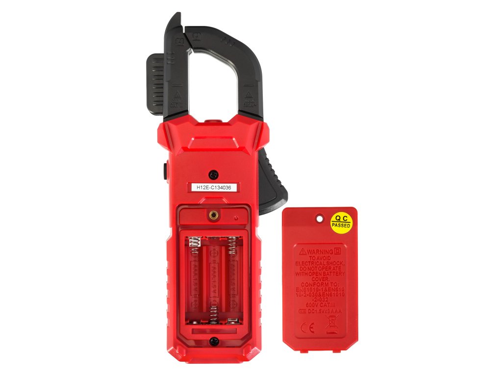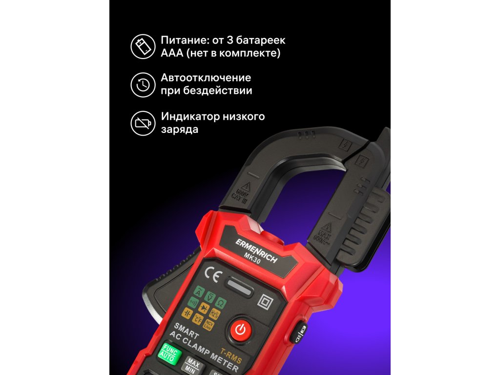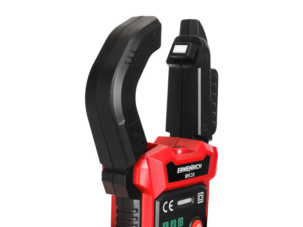 Digitální klešťový měřič Ermenrich Ping MK30 je napájen z baterií, je vybaven funkcí automatického vypnutí a v případě vybitých baterií vás upozorní na nutnost jejich výměny.