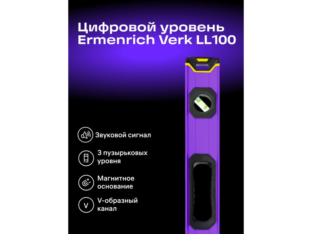 Ermenrich Verk LL100 je digitální vodováha, která kombinuje funkce úhloměru, bublinkové vodováhy a olovnice. Tento přístroj je vhodný pro širokou škálu stavebních a opravárenských prací, montáž strojů a zařízení, umísťování obrobků na stoly strojů a moduly obráběcích center a vyrovnávání pracovních ploch. Dokáže měřit úhly a převádět je na různé jednotky měření. Přístroj má mnoho užitečných funkcí (funkce přidržení zobrazení naměřené hodnoty, funkce nastavení nuly atd.), ale zároveň se snadno používá a je vhodný pro použití v domácnosti.