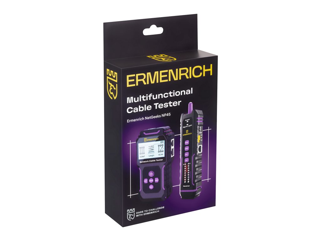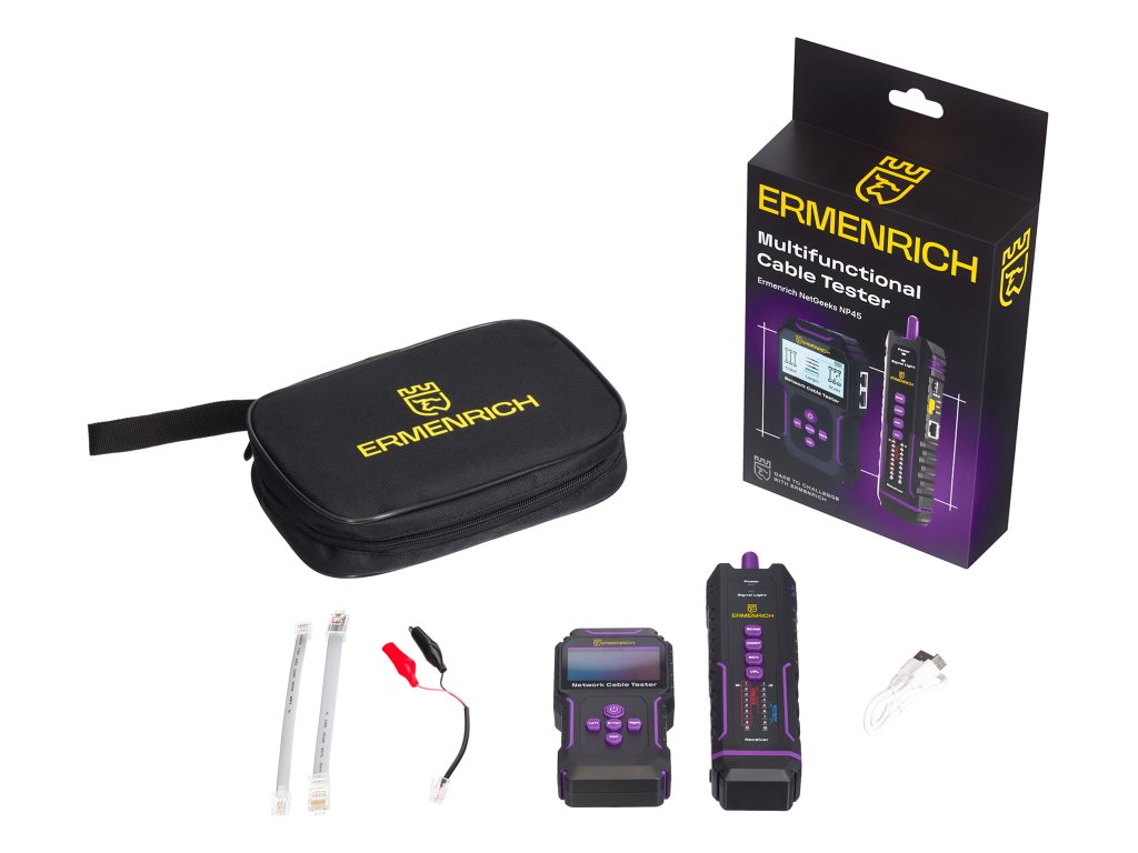 Multifunkční tester kabelů Ermenrich NetGeeks NP45 je speciální přístroj pro testování velkého množství parametrů telefonních, počítačových a kroucených dvoulinkových sítí a také pro detekci poruch kabelů a přerušených obvodů, zjišťování přítomnosti napětí atd. Tester nabízí funkce, které umožňují profesionálům efektivně instalovat, diagnostikovat a opravovat sítě v kancelářích, domácnostech i v průmyslovém prostředí.