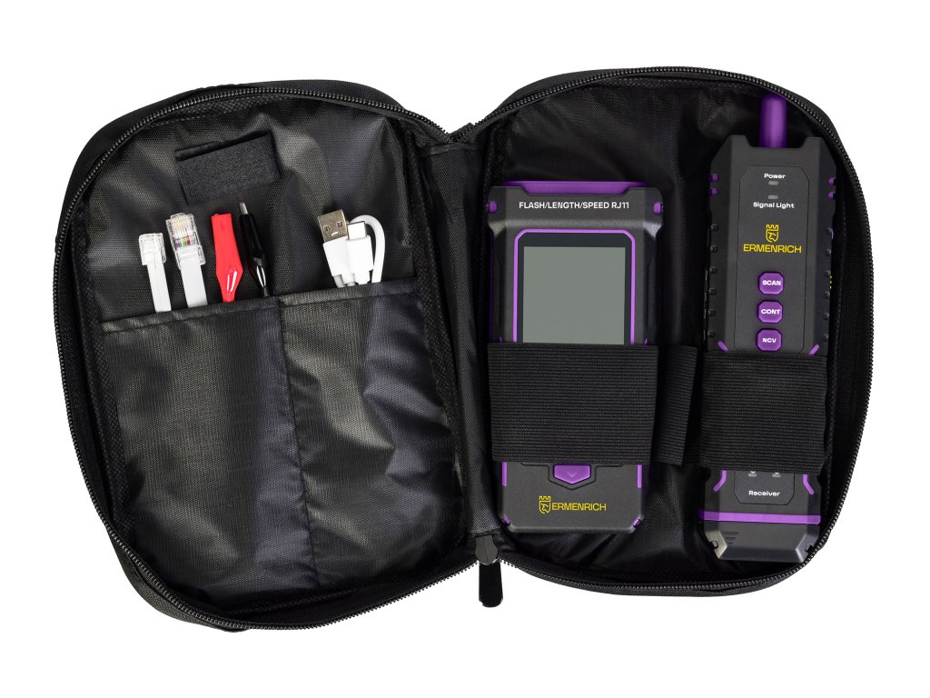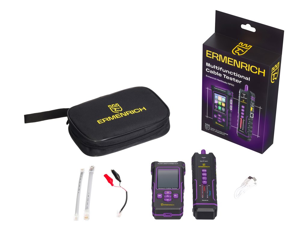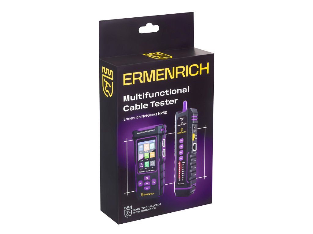 Multifunkční tester kabelů Ermenrich NetGeeks NP50 je určen k testování síťových kabelů STP/UTP kategorií 5/5E/6/6A, měření délky kabelů metodou reflektometrie v časové oblasti (TDR) (v rozsahu 5–200 m), provádění komplexní diagnostiky telefonních a počítačových sítí a detekci kroucených dvoulinek. Přístroj identifikuje místo přerušeného obvodu nebo zkratu ve vedení, změří přibližnou vzdálenost k místu poruchy a také detekuje zkřížené dvojlinky. Maximální délka testovaného kabelu: 1000 m.
