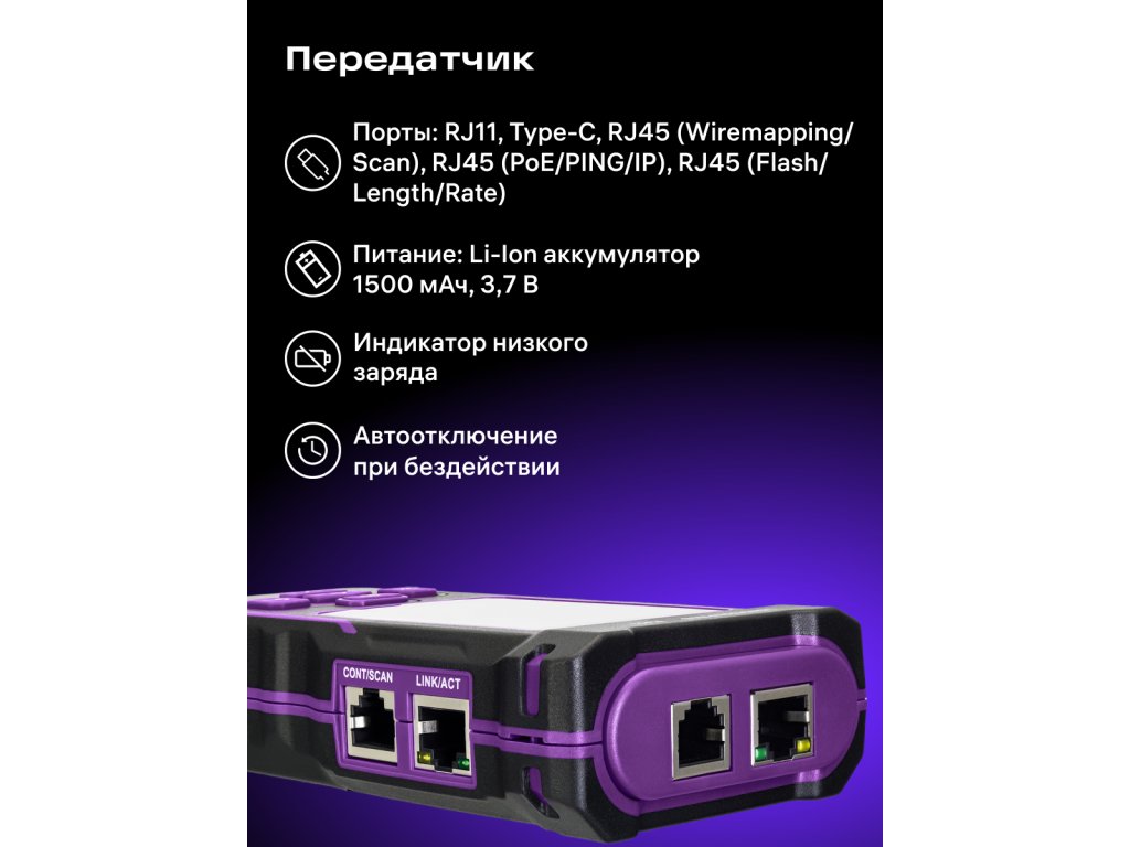 | Porty | RJ11, RJ45 (Flash/Length/Rate), RJ45 (PoE/PING/IP), RJ45 (mapování/skenování), Type-C |