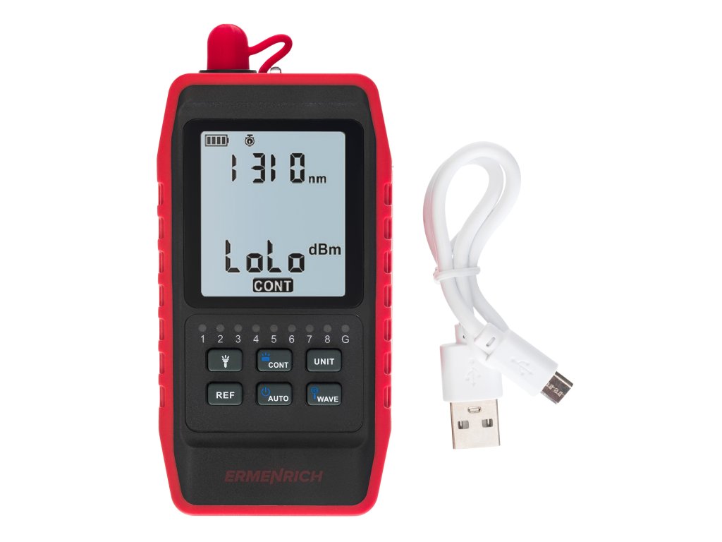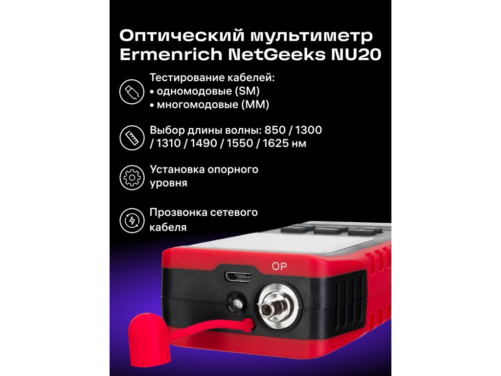 Optický multimetr Ermenrich NetGeeks NU20 je určen k testování optických kabelů. Můžete s ním měřit absolutní optický výkon v libovolném zdroji optického systému, ztrátu optického výkonu v kabelu a provádět test kontinuity pro kontrolu, zda nejsou v kabelech s optickými vlákny nějaké přerušení. Optický multimetr je nepostradatelným vybavením montéry síťových kabelů, správce systémů a inženýry optických vláken pro řešení široké škály profesionálních úkolů. Tento přístroj lze používat i v domácnosti.
