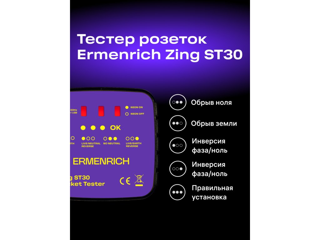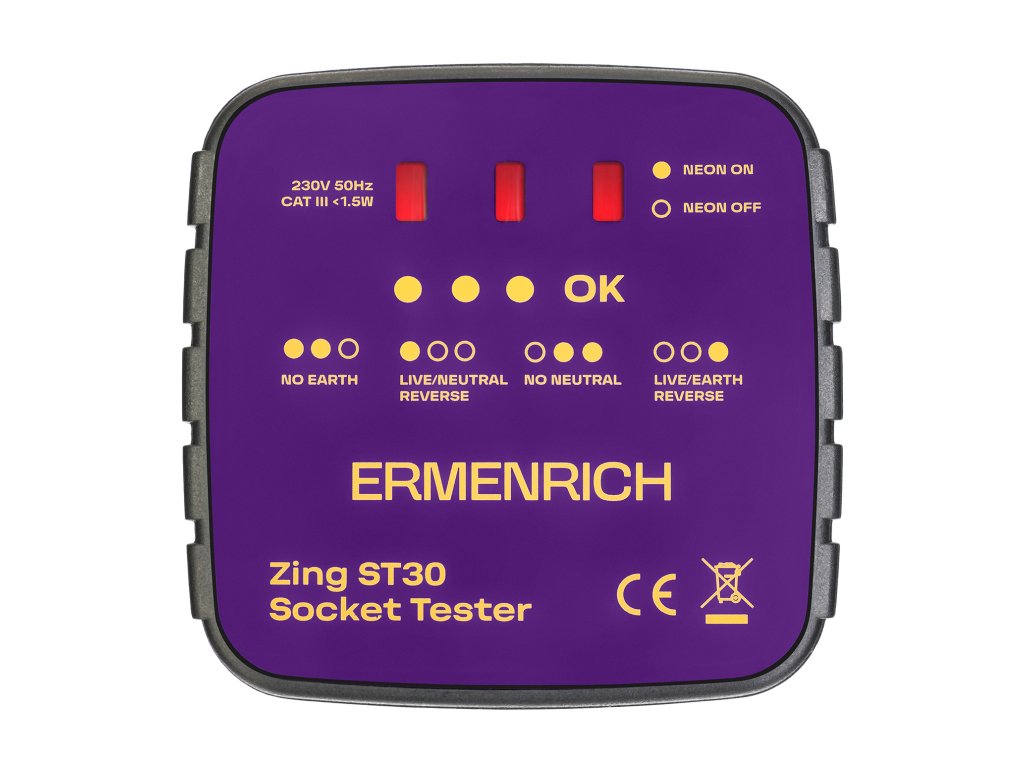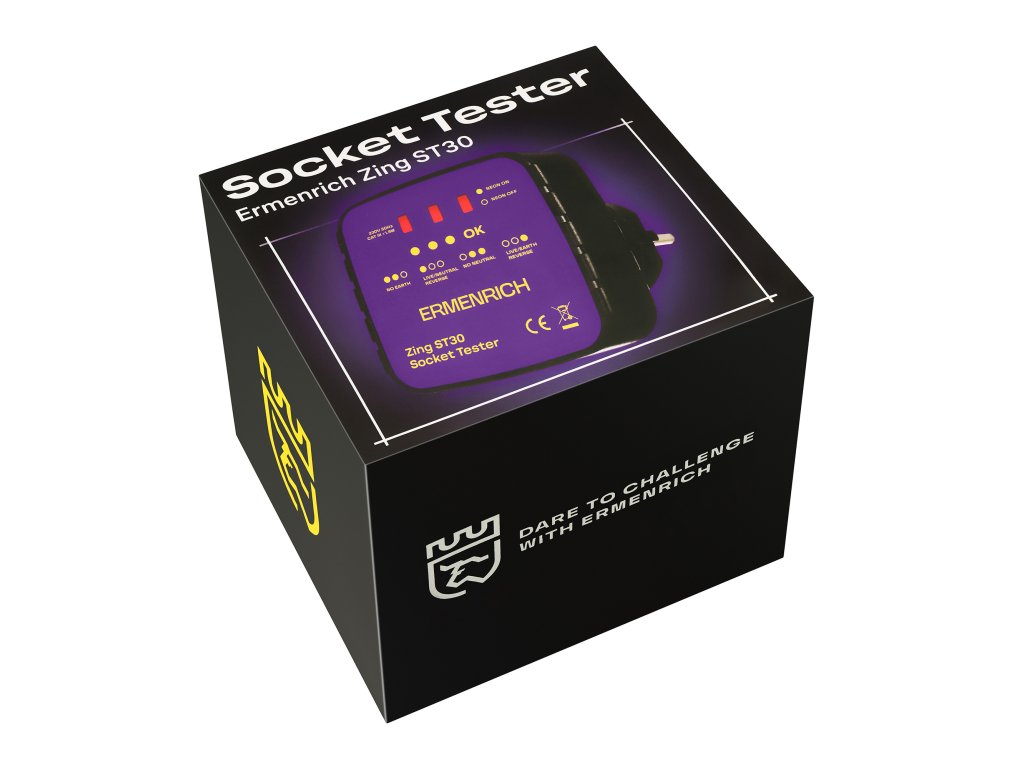 Tester zásuvek Ermenrich Zing ST30 je určen k testování, zda jsou všechny zásuvky správně zapojeny, a ke kontrole napětí. Tester je třeba zapojit přímo do zásuvky a blikání LED kontrolek indikuje různé elektrické závady: chybějící zemnící vodič / chybějící nulový vodič, obrácená polarita fázového a nulového vodiče nebo obrácená polarita fázového a zemnícího vodiče. Kromě toho specifický barevný kód, který se zobrazí na displeji testeru, signalizuje správný stav zapojení. Funkce každého kódu je napsána na přístroji.