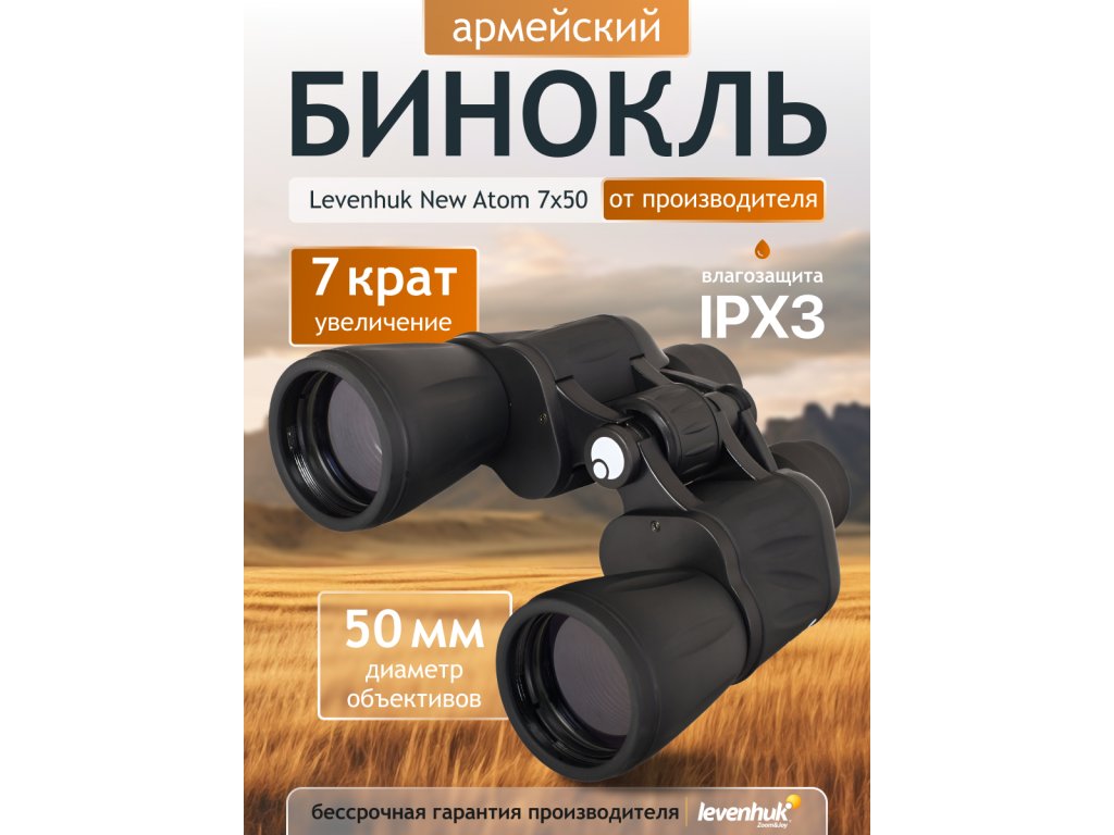 Klasický binokulární dalekohled do terénu Levenhuk New Atom 7x50 je ideální pro lovce, námořníky, aktivní turisty, vojáky a další. Díky 7x zvětšení, velkým 50 mm objektivům s antireflexní vrstvou a porro hranolům poskytuje tento přístroj jasný, ostrý a vysoce kontrastní obraz za různých světelných podmínek. Díky ochraně proti dešti IPX3 můžete tento binokulární dalekohled bez obav používat téměř za jakýchkoli povětrnostních podmínek. Pro pohodlné a dlouhodobé sledování v terénu jej můžete pomocí adaptéru (k dispozici samostatně) připevnit na stativ.