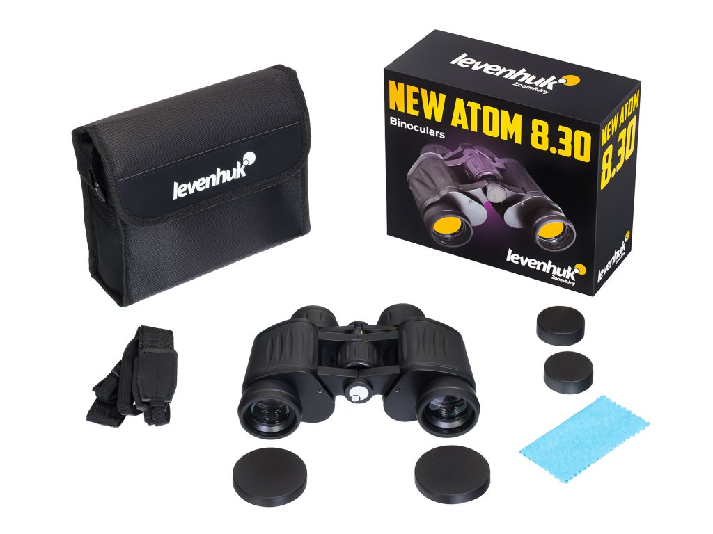 Tělo binokulárního dalekohledu Levenhuk New Atom 8x30 je lehké, protože je vyrobeno z hliníkové slitiny. Texturované gumové rukojeti zajišťují, že vám dalekohled nevyklouzne z rukou. Zařízení je vybaveno ochranou proti vodě IPX3 – mírný déšť nebude narušovat vaše pozorování. Pro větší pohodlí je binokulární dalekohled dodáván s popruhem na krk, ochrannými krytkami objektivů (pro objektivy a okuláry), hadříkem na čištění objektivů a pouzdrem pro skladování a přepravu.