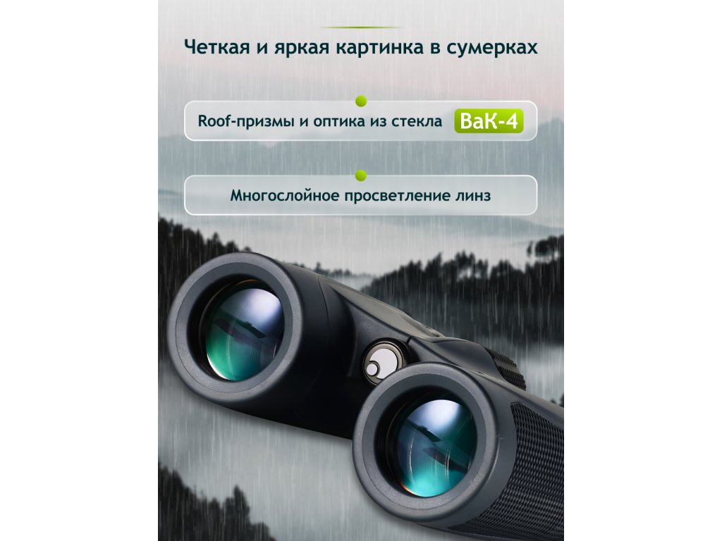 Optika s vícenásobnou antireflexní vrstvou poskytuje jasný, ostrý a čistý obraz i za šera. Binokulární dalekohled se přizpůsobí každému obličeji (rozteč očí 53–74 mm) a obsahuje korekci ±4 dioptrie – ideální pro ty, kdo nosí brýle, a pro ty, kdo potřebují korekci zraku.