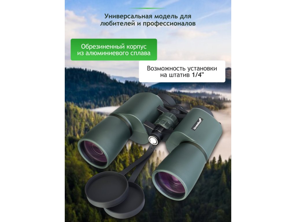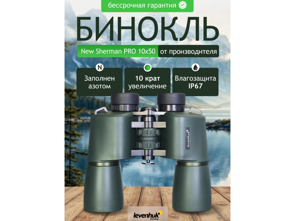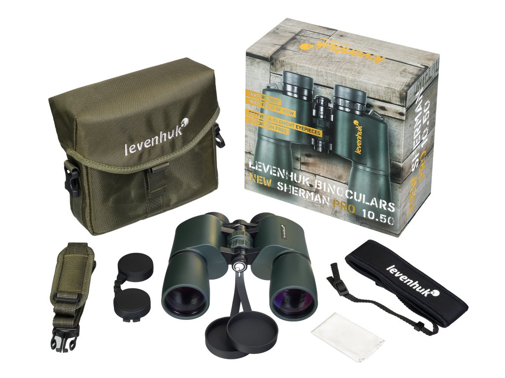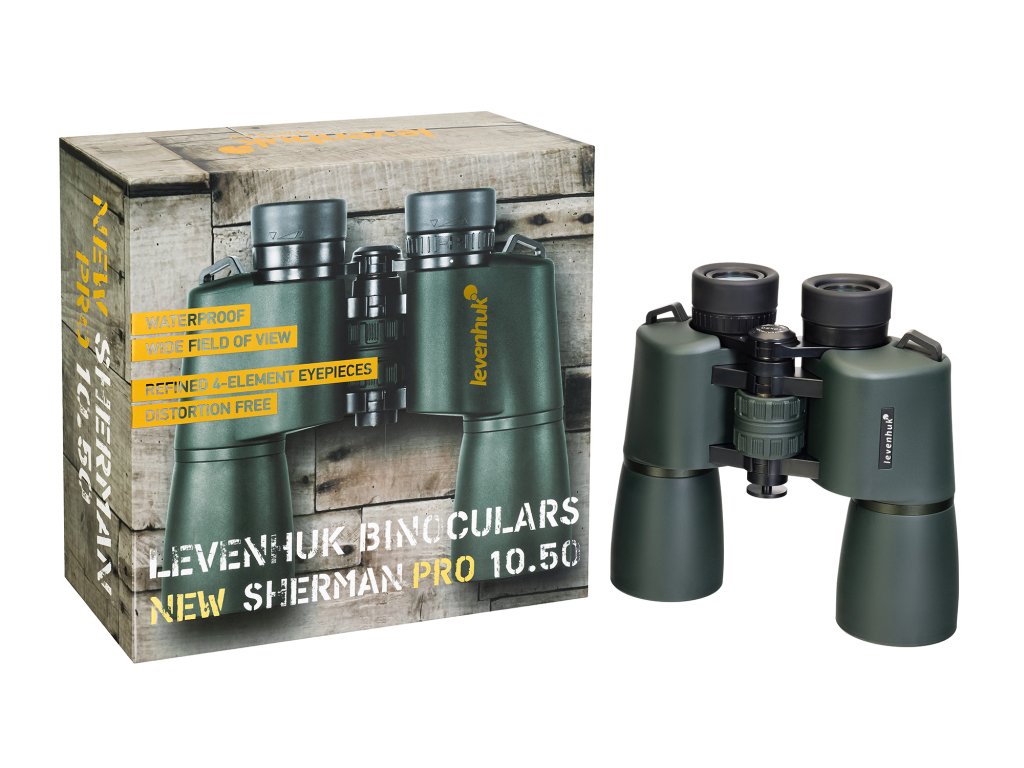 Levenhuk New Sherman PRO je řada binokulárních dalekohledů s porro hranoly s velkou aperturou. Jsou vybaveny vysoce kvalitní skleněnou optikou BaK-4 v mimořádně odolných duralových tělech, která jsou vhodná do každého počasí. Tento model s 10x zvětšením, 50 mm objektivem a vysokou relativní světelností je vynikajícím nástrojem pro pozorování ptáků, lov a turistiku. Díky svým optickým a praktickým vlastnostem je spolehlivou volbou i pro odborníky: geodety, topografy, pracovníky v energetice atd. Čočky a hranoly s vícenásobnou antireflexní vrstvou poskytují ostrý a barevně bohatý obraz. Zařízení se může pochlubit vysokým faktorem stmívání pro efektivní sledování nejen ve dne, ale i večer. Zorné pole je 114 metrů při 1 000 metrech.