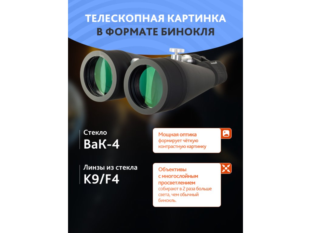 Tento astronomický binokulární dalekohled s Porro hranoly nabízí 20x zvětšení a 80 mm objektiv. Shromažďuje dostatek světla, aby vytvořil jasný a kontrastní obraz za jakýchkoli světelných podmínek. Tímto binokulárním dalekohledem můžete detailně pozorovat Měsíc, meteory, Jupiterovy měsíce a mlhoviny. Kvalitu obrazu zajišťují objektivy z optického skla K9/ZF1 a hranoly z optického skla BaK-4. Objektivy a hranoly mají vícenásobnou antireflexní vrstvu, která zvyšuje jas obrazu.