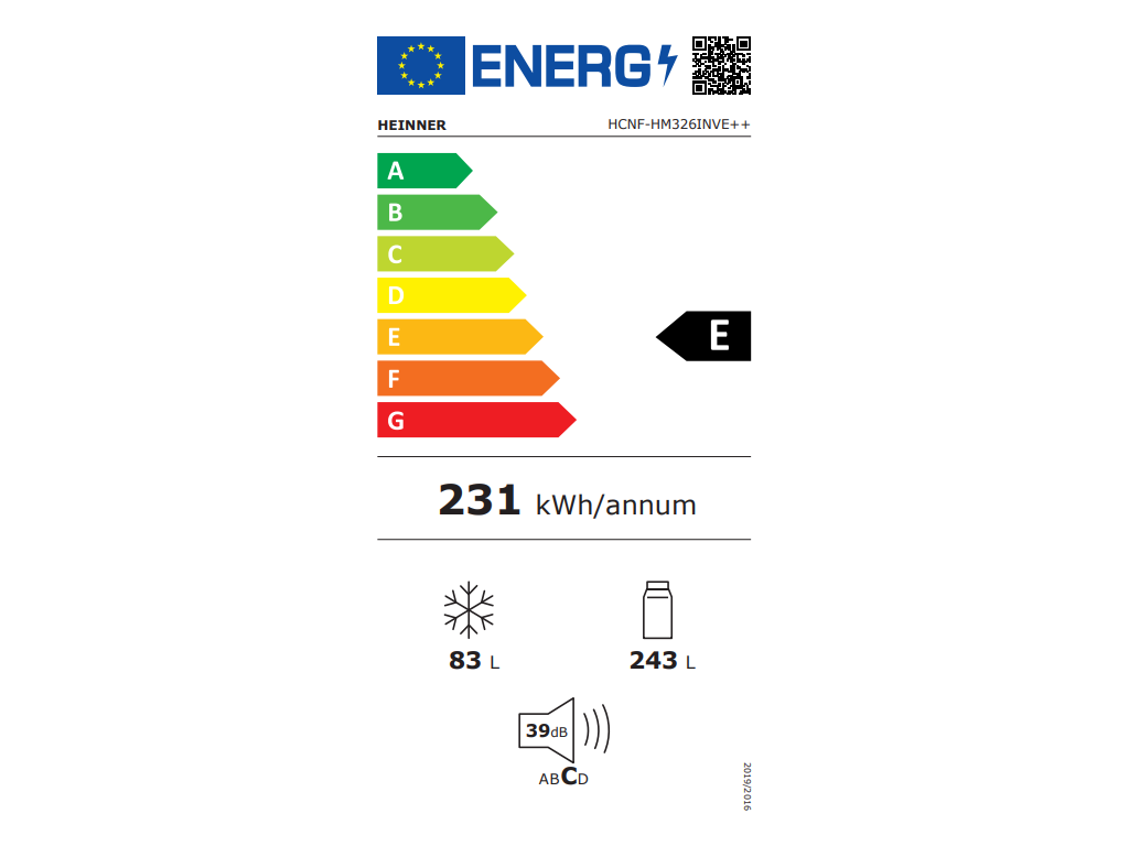 Celkový čistý objem 326 l (224 l chladnička / 102 l mrazák). Energetická třída E, hlučnost 41 dB. Elektronické ovládání s nastavitelným termostatem, mrazicí výkon 5 kg / 24 h. Klimatická třída SN-T. Rozměry: 185,3 x 60 x 63,5 cm.