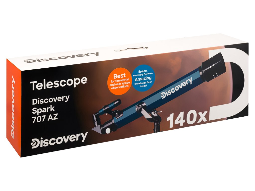 Pokud sníte o pořízení svého prvního hvězdářského dalekohledu nebo hledáte dárek pro začínajícího astronoma, podívejte se na hvězdářský dalekohled Levenhuk Discovery Spark 707 AZ se vzdělávací publikací. Kombinuje vše, co byste mohli potřebovat pro první pohled na noční oblohu: snadné ovládání, širokou škálu astronomických pozorování a rozšířenou sadu příslušenství. Můžete pozorovat detaily měsíční krajiny, planety zemského typu, a dokonce i vzdáleně pozorovat nejjasnější objekty hlubokého vesmíru. Pozemské objekty je možné zkoumat i během dne s využitím hvězdářského dalekohledu jako pozorovacího dalekohledu.