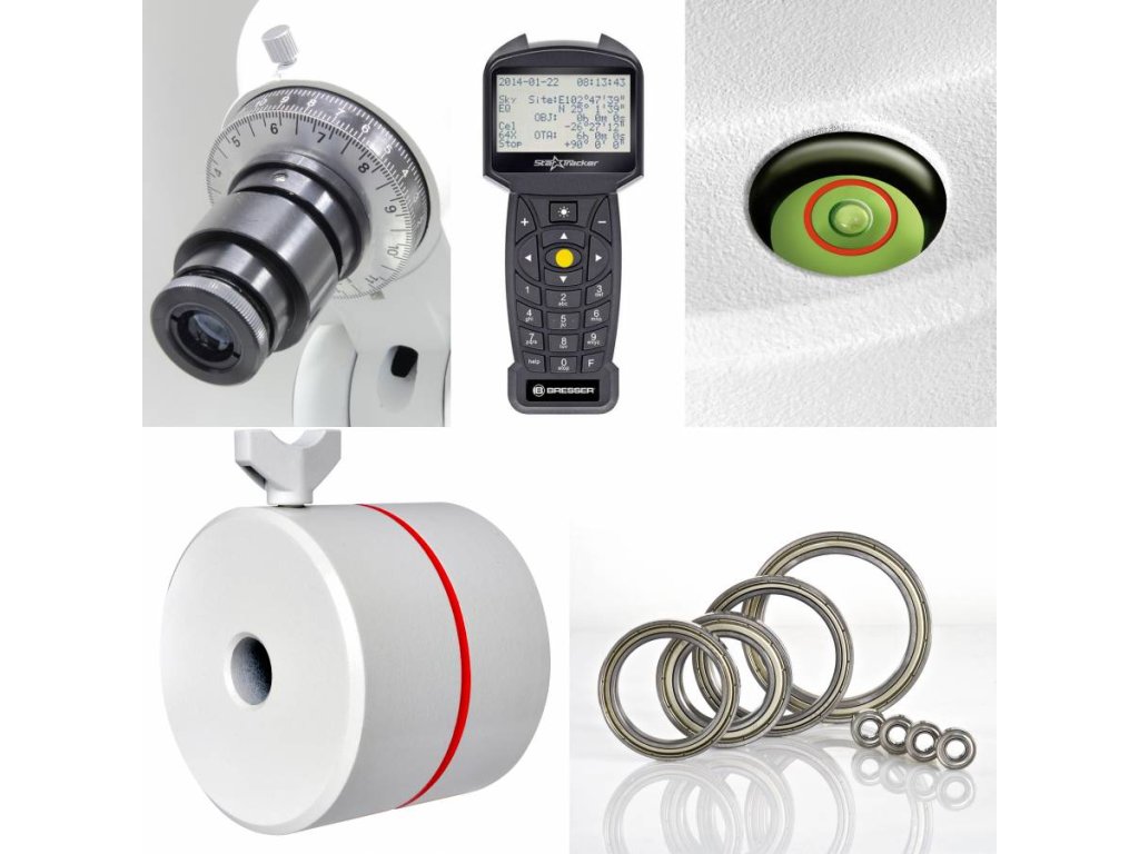 - Všechny osy teleskopu jsou podporovány kuličkovými ložisky pro hladké sledování