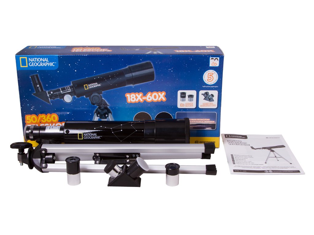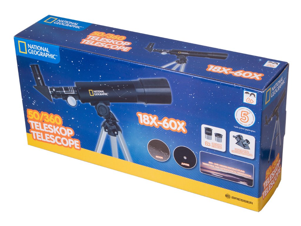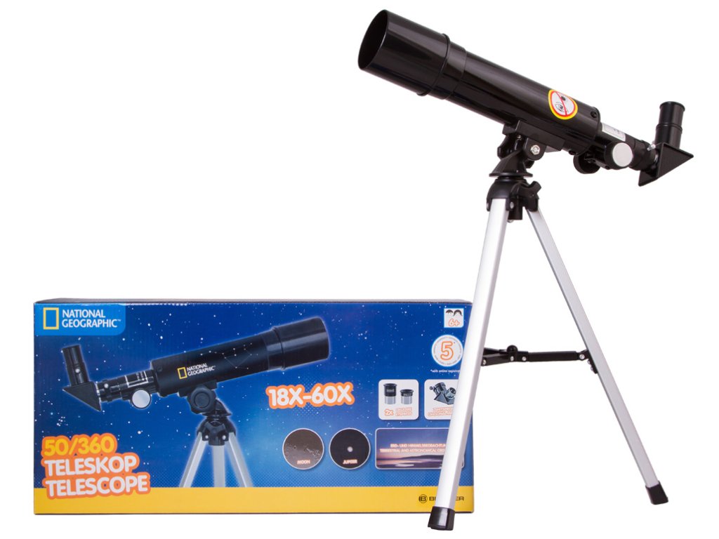 Teleskop National Geographic 50/360 AZ je dokonalou volbou pro dospělého začátečníka nebo pro dítě. Jedná se o lehký a kompaktní optický přístroj, který lze instalovat na parapet okna nebo balkon vašeho bytu. Tento teleskop je vhodný k pozorování Měsíce, planet a pozemních cílů. Dále je skvělý k pozorování asteroidů a komet prolétajících v blízkosti Země. Za dobrých povětrnostních podmínek budete moci spatřit i mezinárodní kosmickou stanici.