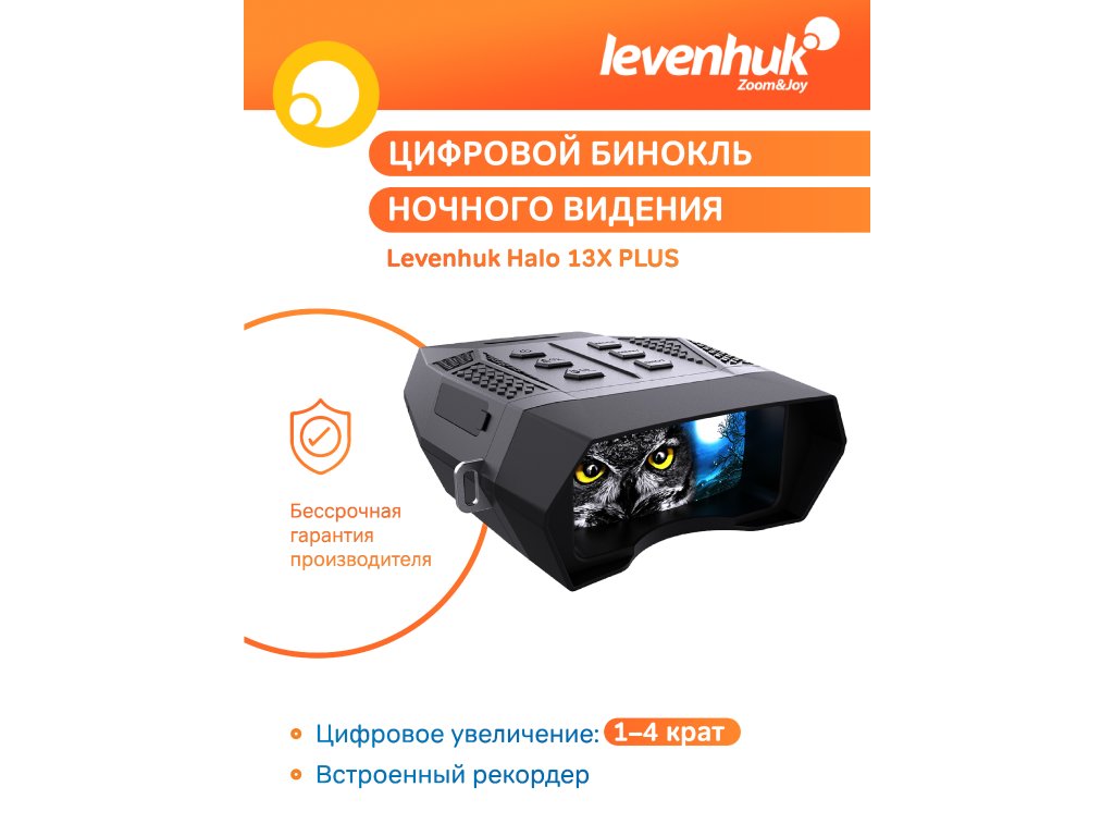 Binokulární dalekohled s nočním viděním Levenhuk Halo 13X PLUS – skvělý přístroj pro pozorování v různých prostředích. Binokulární dalekohled není ovlivněn denním světlem a lze jej používat nejen jako zařízení pro noční vidění, ale i jako běžný binokulární dalekohled. Binokulární dalekohled je voděodolný, je vybaven rekordérem a IR přísvitem, a lze jej upevnit na stativ. Tento binokulární dalekohled bude skvělým nástrojem pro noční lov a turistiku a hodí se také pro ochranu území a průzkum.