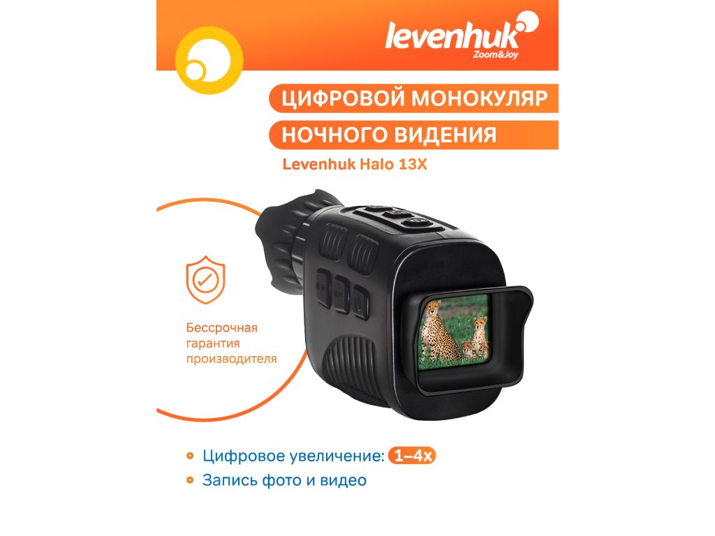 Digitální monokulární dalekohled Levenhuk Halo 13X pro noční vidění je vybaven vestavěným rekordérem, takže jej lze použít pro vizuální pozorování i pro záznam fotografií a videa. Zařízení účinně funguje i v úplné tmě. Za denního světla jej lze použít také jako běžný monokulární dalekohled. Levenhuk Halo 13X je vynikající volbou pro noční lov, orientační běh, válečné hry a hlídkování.