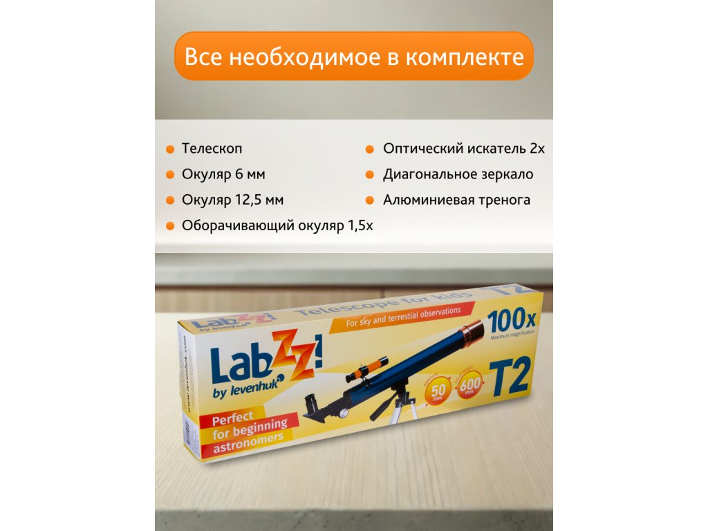Teleskop Levenhuk LabZZ T2 se dodává s diagonálním zrcátkem a vzpřimujícím okulárem. Oba doplňky vytváří správně orientovaný obraz a okulár navíc 1,5 krát zvyšuje výkon dalekohledu. Díky těmto doplňkům je pozemní pozorování s přístrojem Levenhuk LabZZ T2 pohodlné, snadné a zábavné.