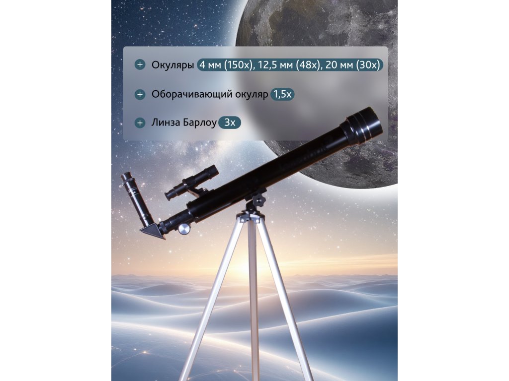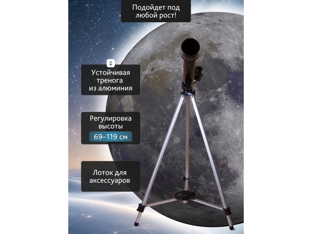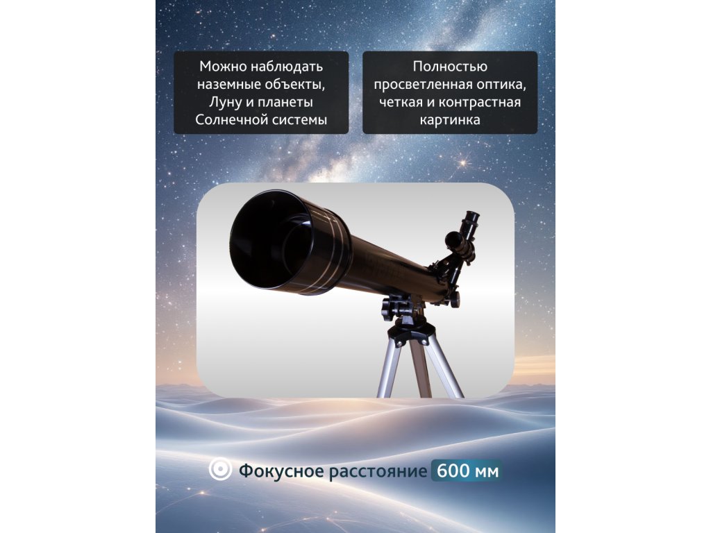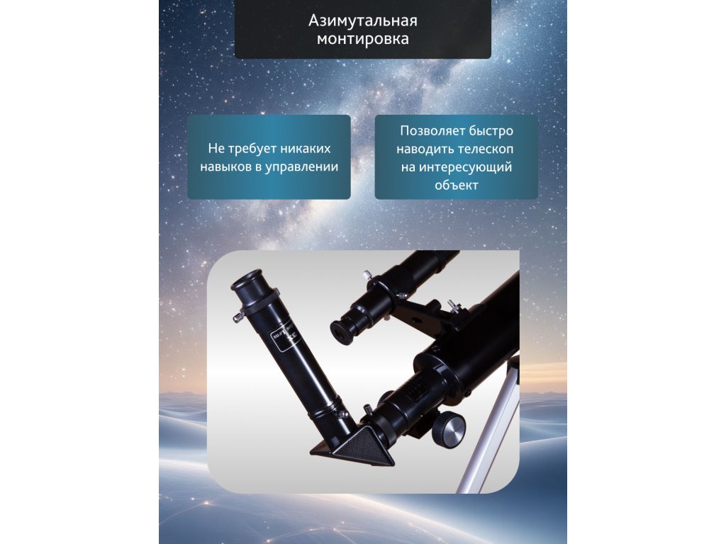 Čočky v refraktoru jsou vyrobeny ze skla a jsou plně pokryty krycí vrstvou. Díky tomu může teleskop vytvářet ostrý a kontrastní obraz i při maximálním zvětšení. Pro pozorování nebeských objektů se používá optický hledáček s 5násobným zvětšením. Azimutální montáž nevyžaduje speciální dovednosti pro ovládání teleskopu a umožňuje rychlé zaměřování pozorovaných objektů.