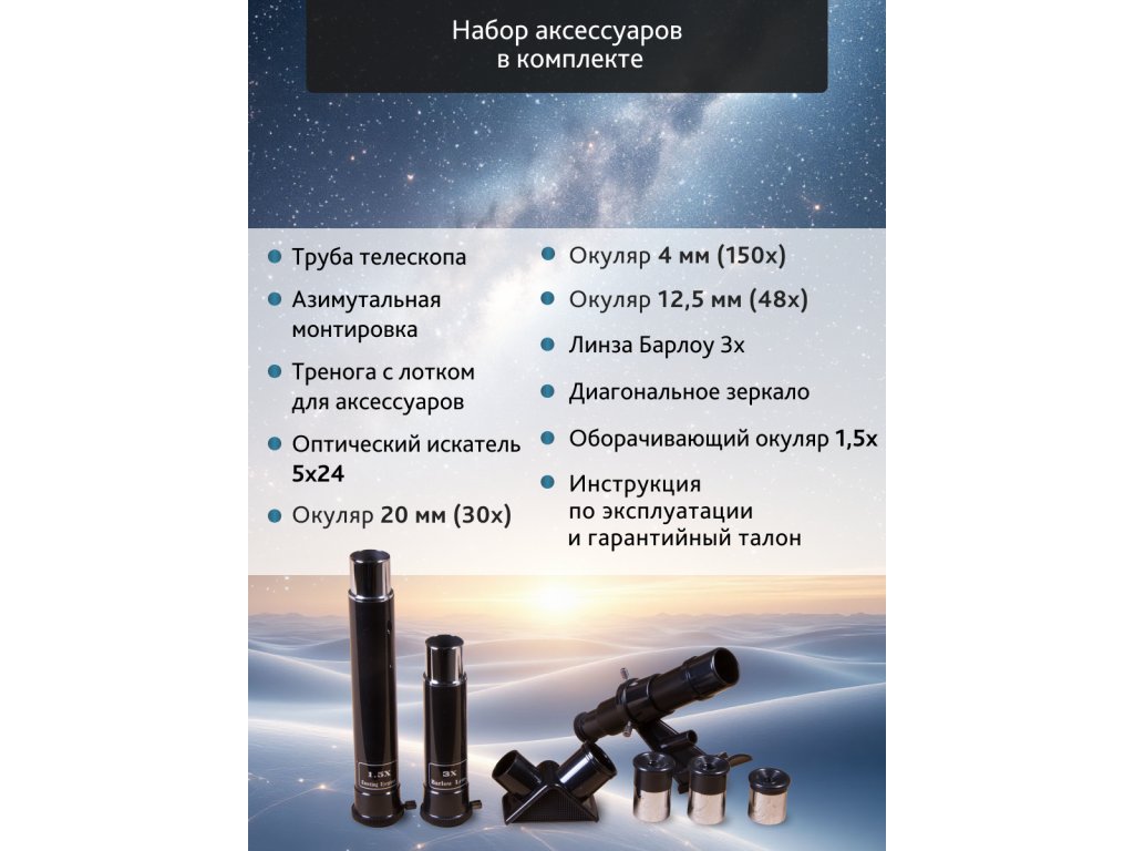 Sada obsahuje dva okuláry: jeden okulár umožňuje zvětšení 150x, druhý pak zvětšení 30x. K dispozici je ještě jedno příslušenství, diagonální zrcadlo, které je nezbytné pro pozemská pozorování. Umožňuje pozorování okolního světa běžným způsobem (ve svislé poloze), kdy teleskopy obracejí obraz vrchní stranou dolů. Diagonální zrcadlo tento stav kompenzuje.
