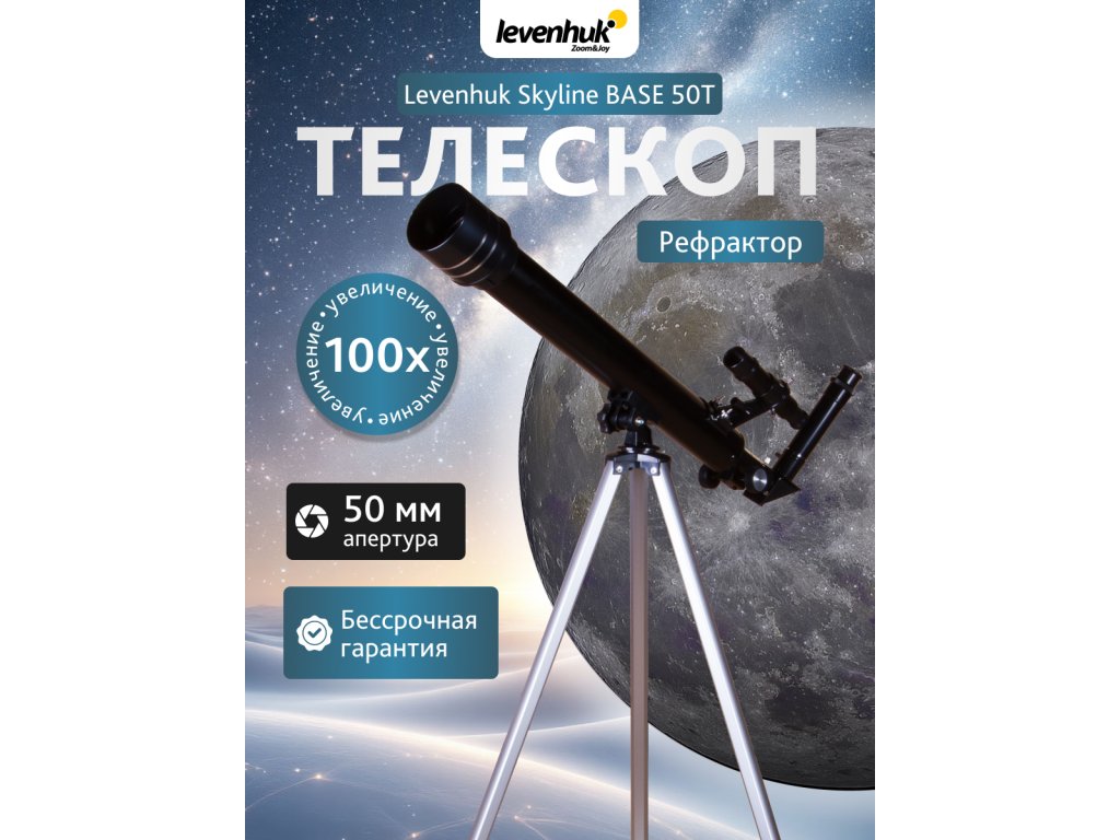 Teleskop Levenhuk Skyline BASE 50T je "juniorským" modelem v produktové řadě Levenhuk Skyline BASE, určeným pro začínající astronomy. Tento refraktor je ideální pro první astronomická pozorování: jeho montáž je velmi snadná, hlavní příslušenství je již obsaženo v sadě; a navíc, tento teleskop může ovládat dokonce i dítě. S teleskopem Levenhuk Skyline BASE 50T můžete pozorovat pozemské objekty, Měsíc a planety Sluneční soustavy.