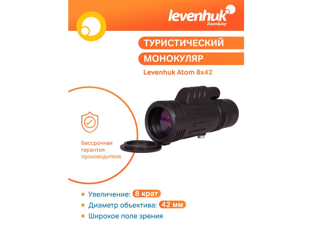 Tato monokulární optika je vyrobena z vícevrstvého skla BK-7. Výsledný obraz je ostrý, kontrastní a vizuálně příjemný. Čočky objektivu zachycují značné množství světla, a proto monokulární dalekohledy dobře fungují i za soumraku. Díky širokému zornému poli je tato optika vhodná pro pozorování velkých ploch. Levenhuk Atom 8x42 umožňuje pozorovat pohyblivé cíle, skupiny zvířat nebo davy lidí. Tento monokulární dalekohled obsahuje dlouhý oční reliéf a otočné (šroubovací) očnice, které jsou vhodné pro pozorování s brýlemi. K dispozici je korekce dioptrií pro osoby s nedokonalým zrakem.