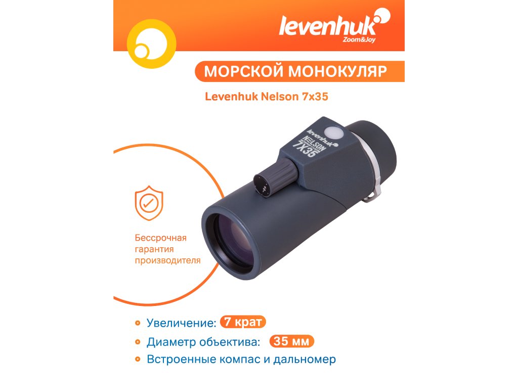 Námořní monokulární dalekohled Levenhuk Nelson 7x35 je vybaven vestavěným kompasem a dálkoměrem. Tyto pomůcky umožňují optickému přístroji měřit vzdálenost k objektům a určovat směr objektů vůči světovým stranám. Monokulár je lehký a odolný; v batohu nezabere moc místa. Tento optický přístroj doporučujeme příznivcům rybolovu a majitelům malých plavidel.