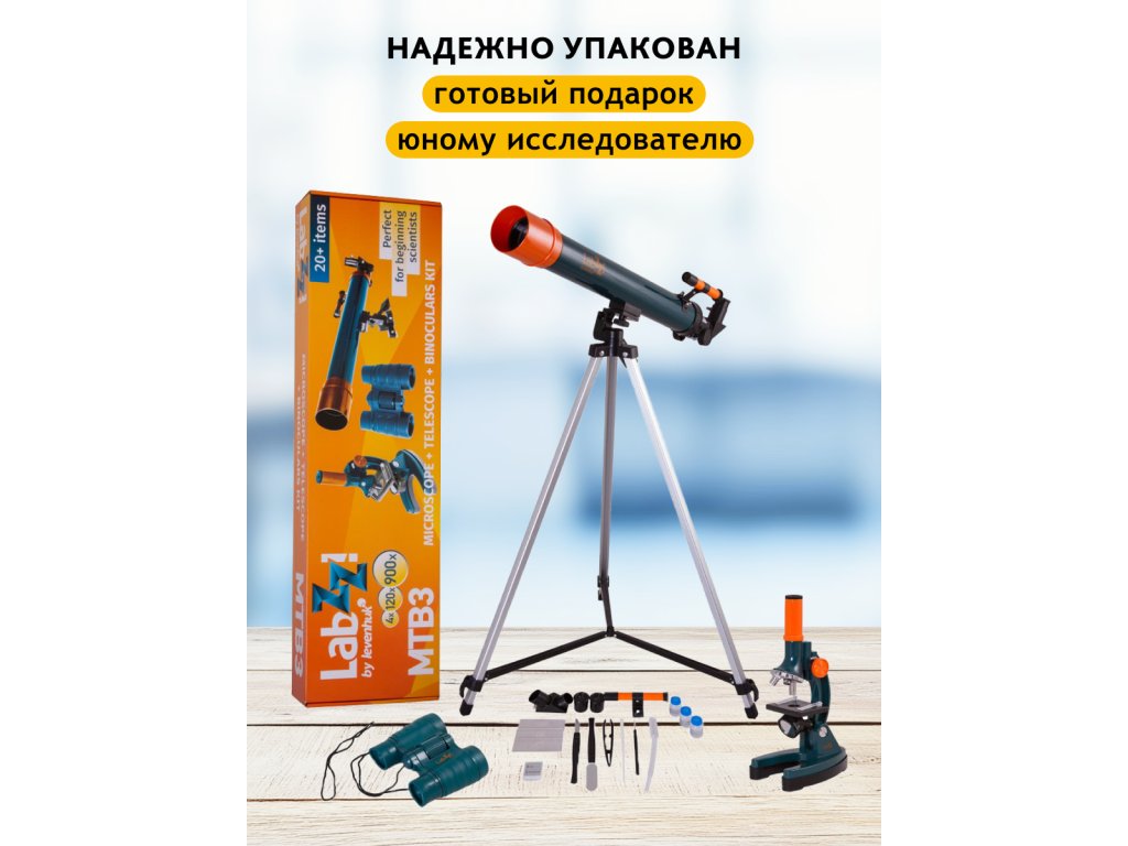 Sada Levenhuk LabZZ MTB3 Kit je ideální dárek pro zvídavé dítě. Sada obsahuje tři optické přístroje – mikroskop, teleskop a binokulární dalekohled. Všechny tři jsou navrženy tak, aby vyhovovaly potřebám mladých pozorovatelů, přičemž jejich možnosti jsou podobné modelům „pro dospělé“. Souprava pomůže dítěti ponořit se mezi všechny divy a tajemství světa kolem nás – vaše dítě může studovat mikrosvět, vesmír a objevovat podmanivou říši divoké přírody.