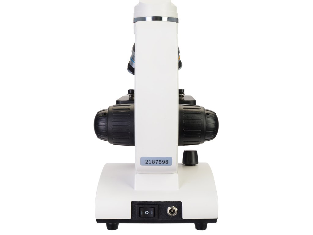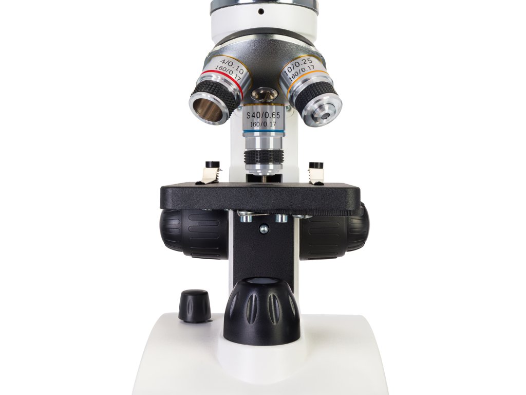 Mikroskop je opatřen monokulární hlavou, kterou lze otáčet o 360°. Tuto schopnost oceníme hlavně při pozorování ve skupinách, zvláště tehdy, když potřebujeme sdílet obrázky s ostatními. Není nutno přemísťovat celý mikroskop, stačí jen pootočit hlavu okuláru. Hlavu lze naklonit pod úhlem 45°, což nám usnadní práci při dlouhodobém pozorování. Optika mikroskopu je vyrobena ze skla: širokoúhlý okulár a achromatické objektivy. Čočka objektivu s 40x zvětšením je pokryta ochrannou vrstvou a vybavena ochranným pružinovým rámem, díky kterému je lépe chráněna před možným poškozením. Přístroj lze nastavit pomocí hrubého a jemného zaostřování.
