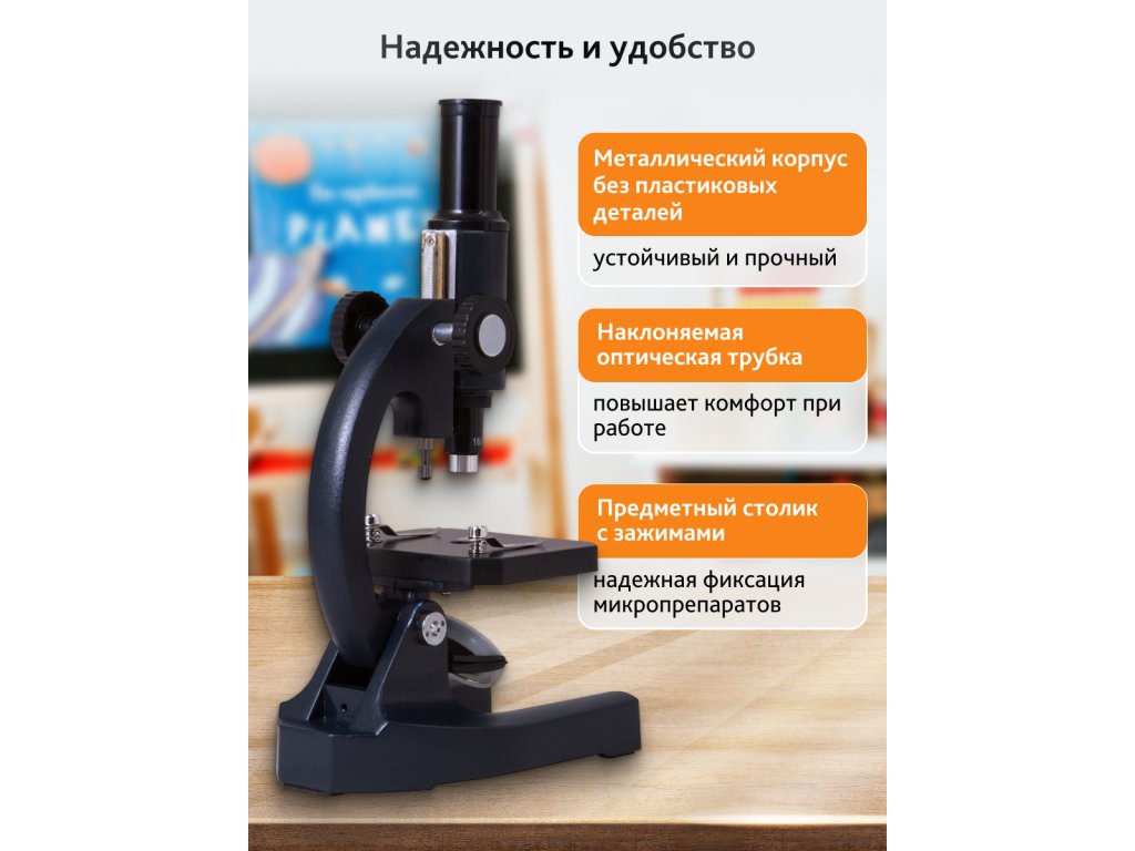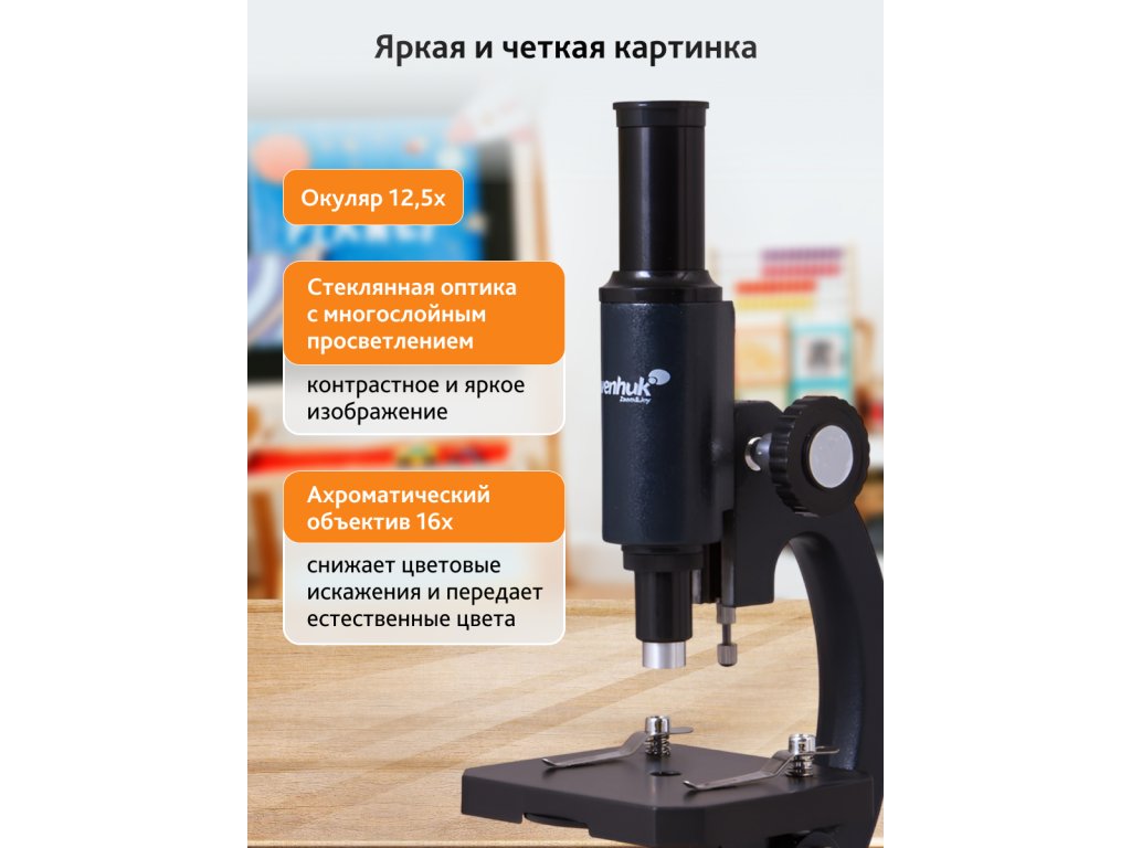 Tento monokulární mikroskop má jediný achromatický objektiv o zvětšení 16x, který nabízí jasný obraz bez jakékoli chromatické nebo sférické aberace. Hlavice mikroskopu je umístěna přímo nad pracovním stolkem, ale pro pohodlné pozorování můžete pomocí ramene mikroskopu hlavici i pracovní stolek naklonit do požadovaného úhlu.