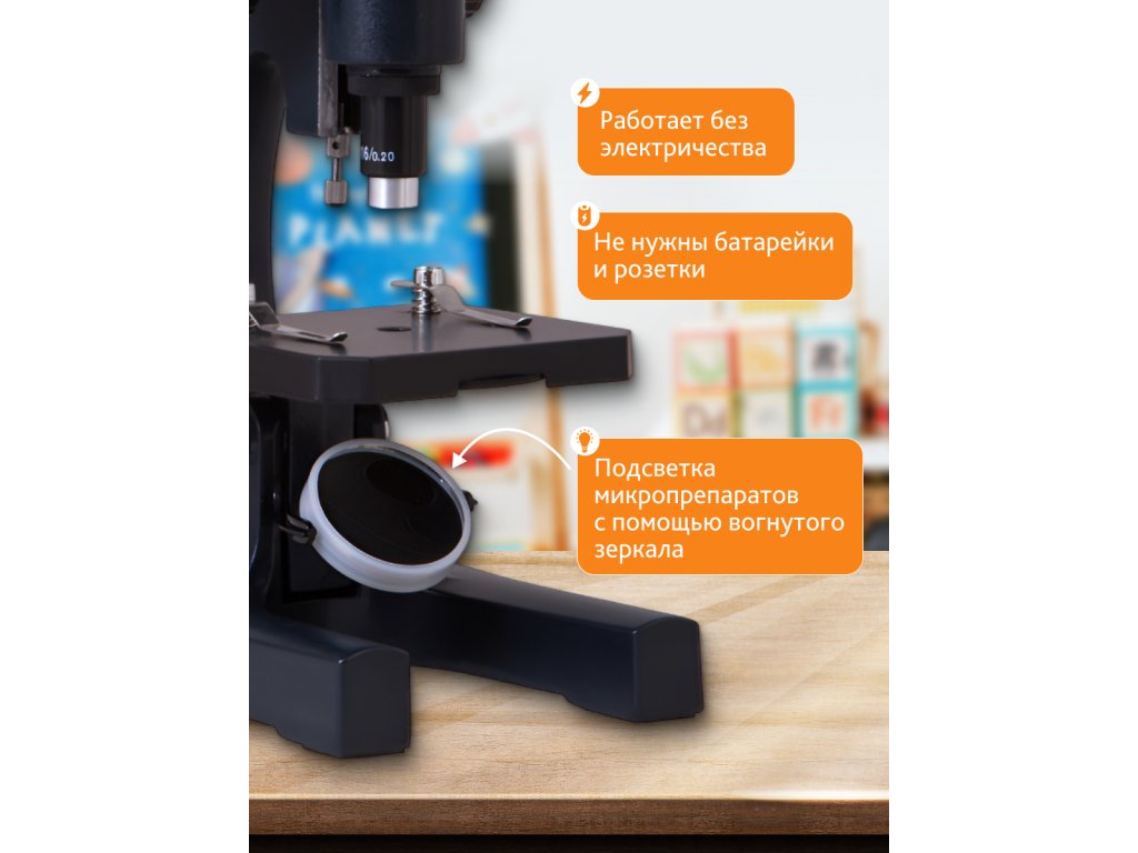 Levenhuk 2S NG umožňuje pozorování transparentních vzorků v jasném zorném poli. Planokonkávní zrcátko o průměru 40 mm zajišťuje dostatek světla pro pozorování, což znamená, že tento mikroskop můžete používat i bez připojení ke zdroji elektrické energie. Jedná se o nejsnadnější a nejbezpečnější osvětlovací metodu, proto mohou tento vzdělávací mikroskop bezpečně používat i děti. Množství světla potřebného pro studium preparátu vám umožňuje regulovat kruhová clona.