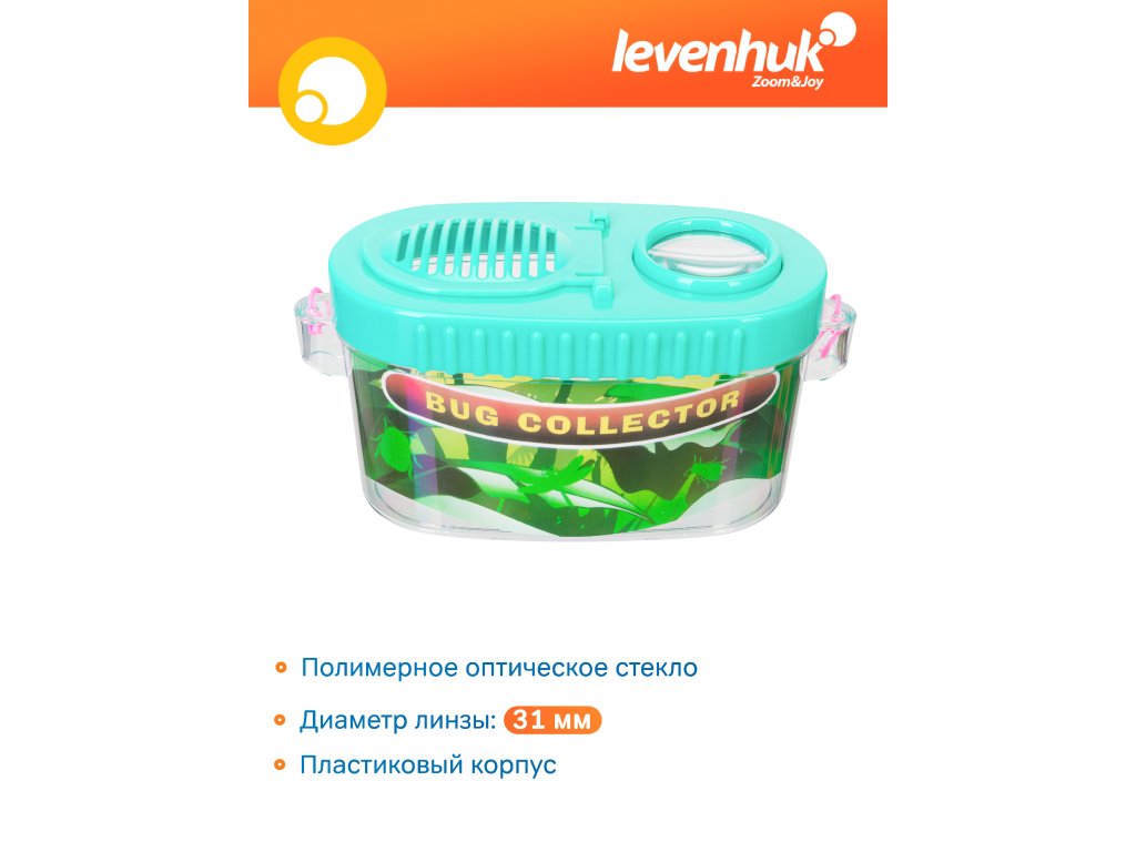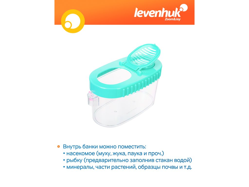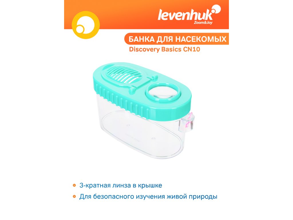 Nádoba na hmyz Levenhuk Discovery Basics CN10 je užitečný nástroj pro studium volně žijících živočichů. Jedná se o nádobu s průhlednými stěnami a dnem, takže můžete studovat objekty z různých úhlů. Víko nádoby je neprůhledné s výjimkou čočky s 3x zvětšením. Do nádoby můžete vložit hmyz (mouchu, brouka, pavouka atd.) nebo rybu (nezapomeňte sklenici nejprve naplnit vodou!), a zblízka a co nejbezpečněji si jej prohlížet.
