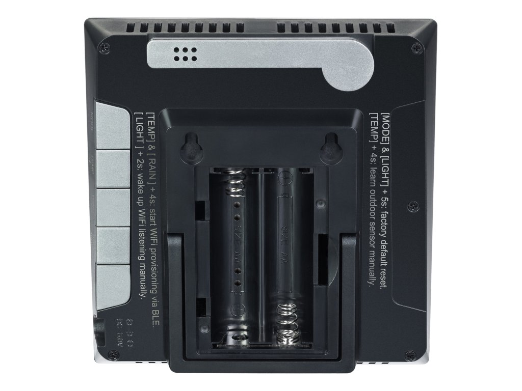 | Napájení | 5 V z AC síťového zdroje, dálkový senzor: baterie AA 1,5 V – 2 ks (nejsou součástí dodávky), meteorologická stanice: baterie AA – 2 ks (nejsou součástí dodávky), solární baterie |