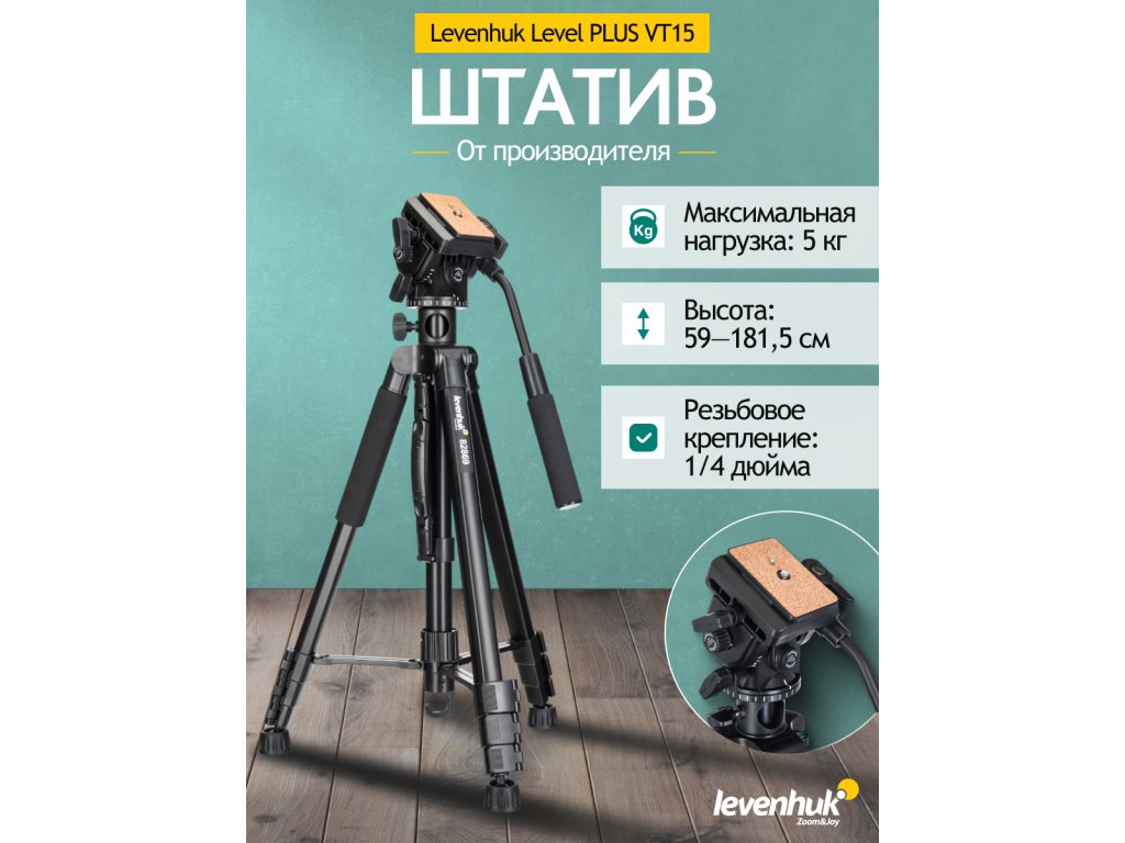 Levenhuk Level PLUS VT15 je univerzální stativ, který unese zařízení o hmotnosti až 5 kg. Může se jednat o fotografické a video vybavení, stejně jako o osvětlovací zařízení nebo optické přístroje. Je určen pro standardní 1/4" závit, ale některé typy zařízení mohou vyžadovat další adaptér.