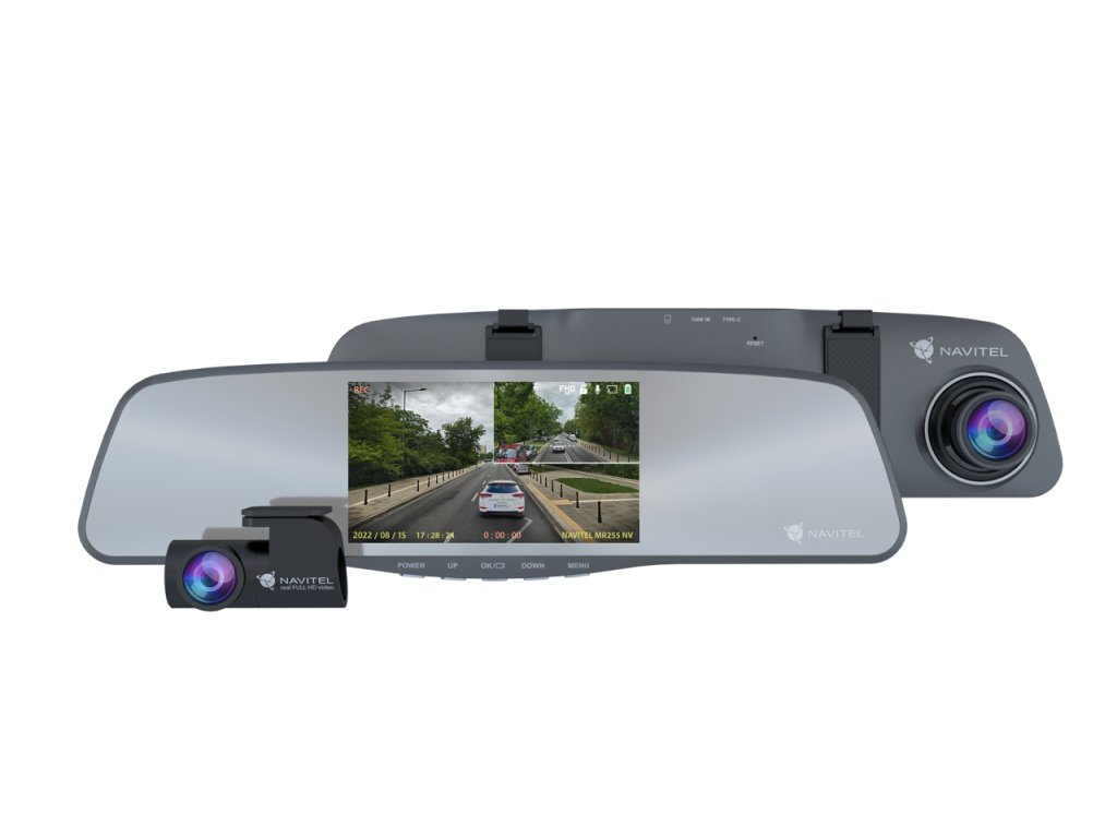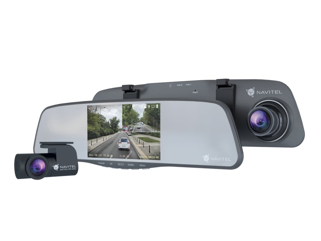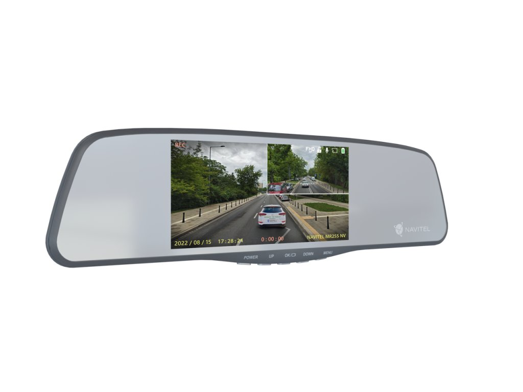Navitel MR255 NV inteligentní zpětné zrcátko s Full HD dvoukanálovým DVR a 5” displejem. Zachycuje kvalitní video za všech světelných podmínek s přídavnou zadní kamerou a širokým 160° úhlem záběru.