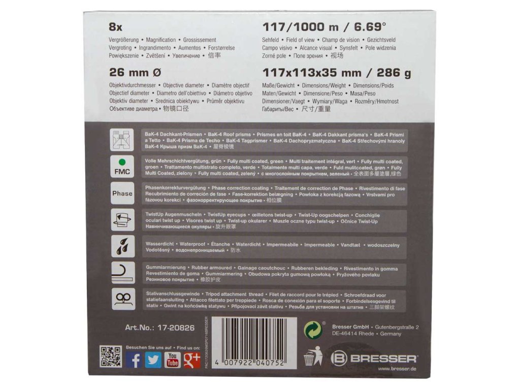 The binoculars are armed with the newest phase coating and let the picture shine more clear in contrast and high-definition, reinforced by fully-multicoated. Because of BaK-4 glass material you get a bright and clear picture. Based on twist-up eyecups spectacle wearers can also enjoy the full field of view. They are adjustable in 2 steps and also support the view without glasses. The Bresser Pirsch Binoculars have a rubber armored body for solid grip. All Pirsch models are armed with a broad and very comfortable neckstrap. To make the package complete these binoculars are waterproof and nitrogen purged to prevent them against fogging.