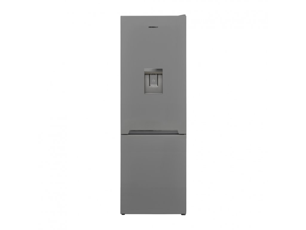 Kombinovaná chladnička Heinner HC-V2701SWDE++, třída energetické náročnosti: E, celkový objem: 268L, objem chladničky: 184, objem mrazničky: 84L, mechanické ovládání s nastavitelným termostatem, LED osvětlení, funkce Super mrazení, 3 skleněné police lednice, 3 zásuvky mrazničky, přihrádka na ovoce a zeleninu, dávkovač vody, rozměry (ŠxHxV): 54 x 59,5 x 170 cm, stříbrná