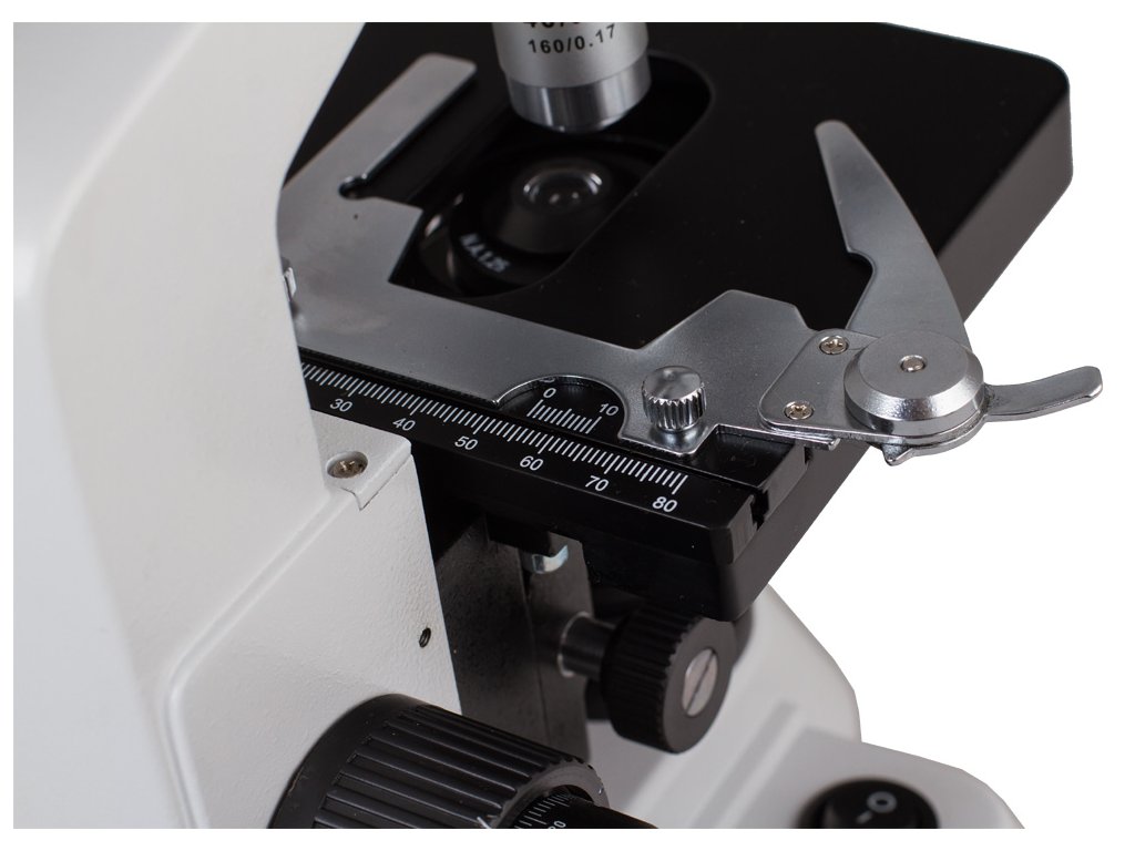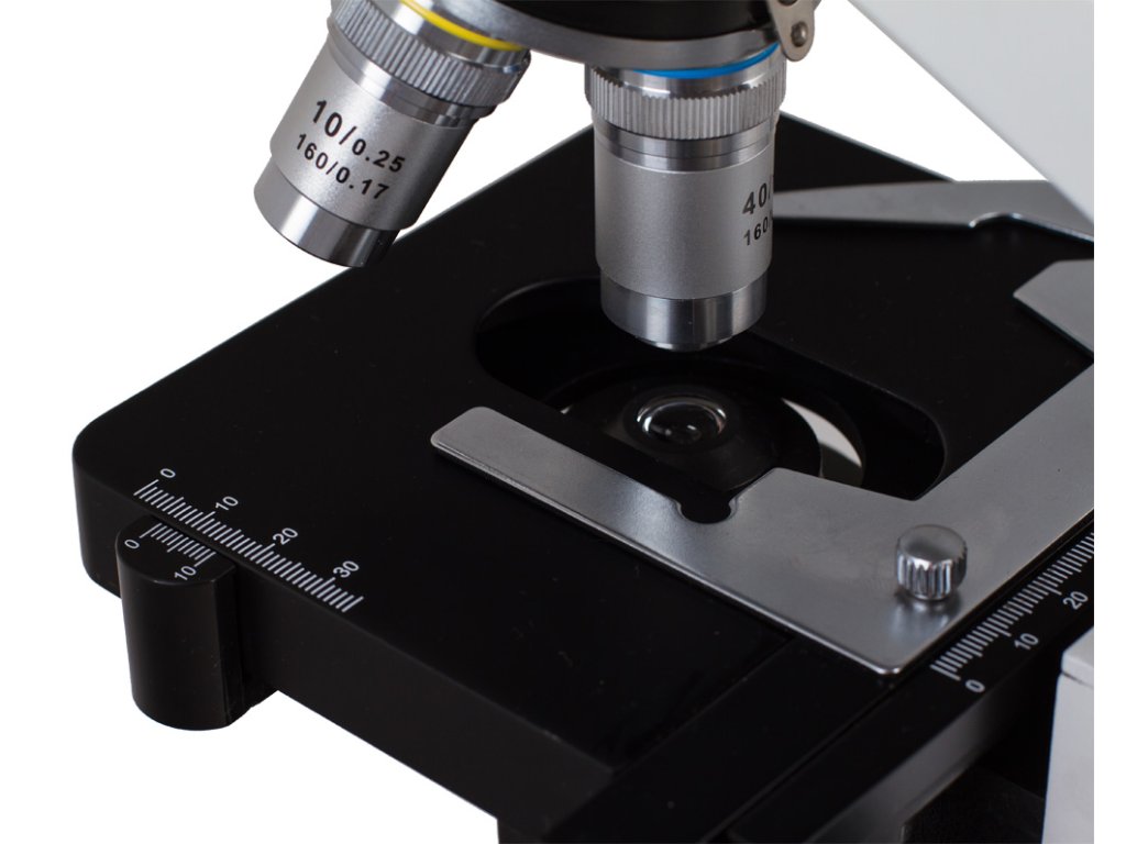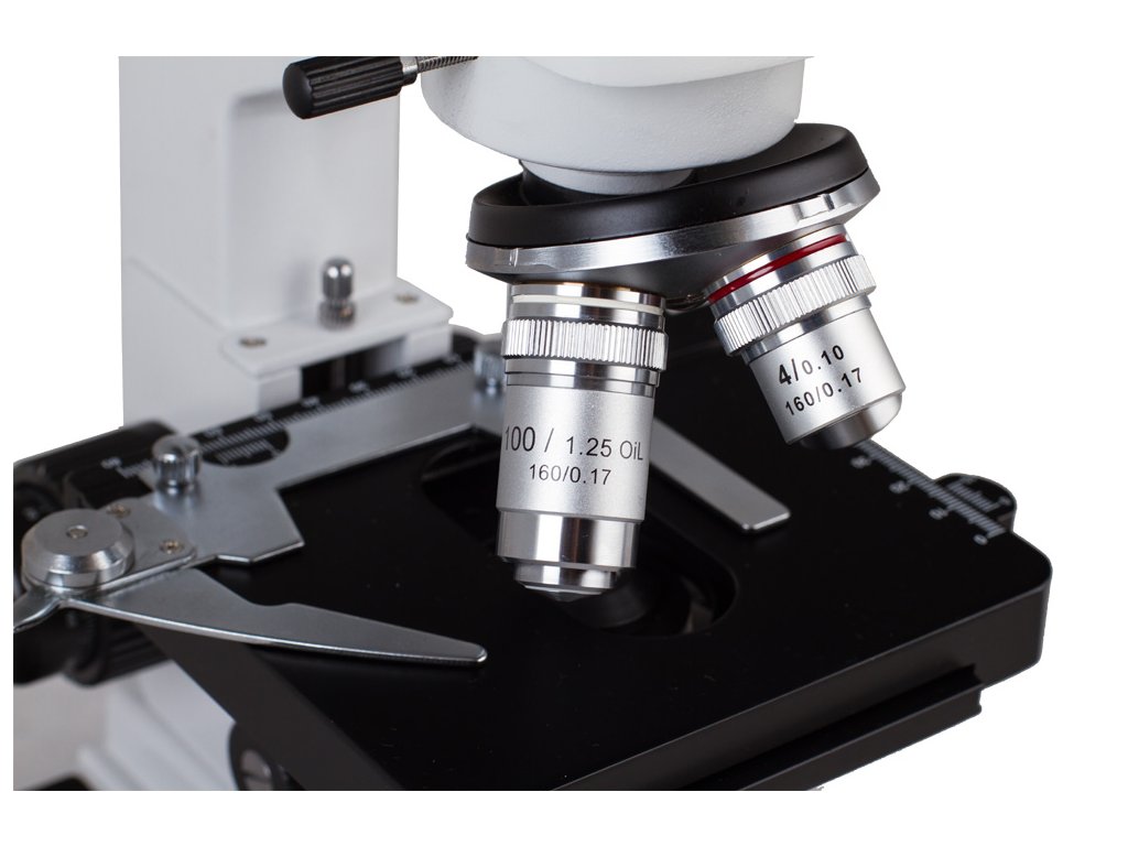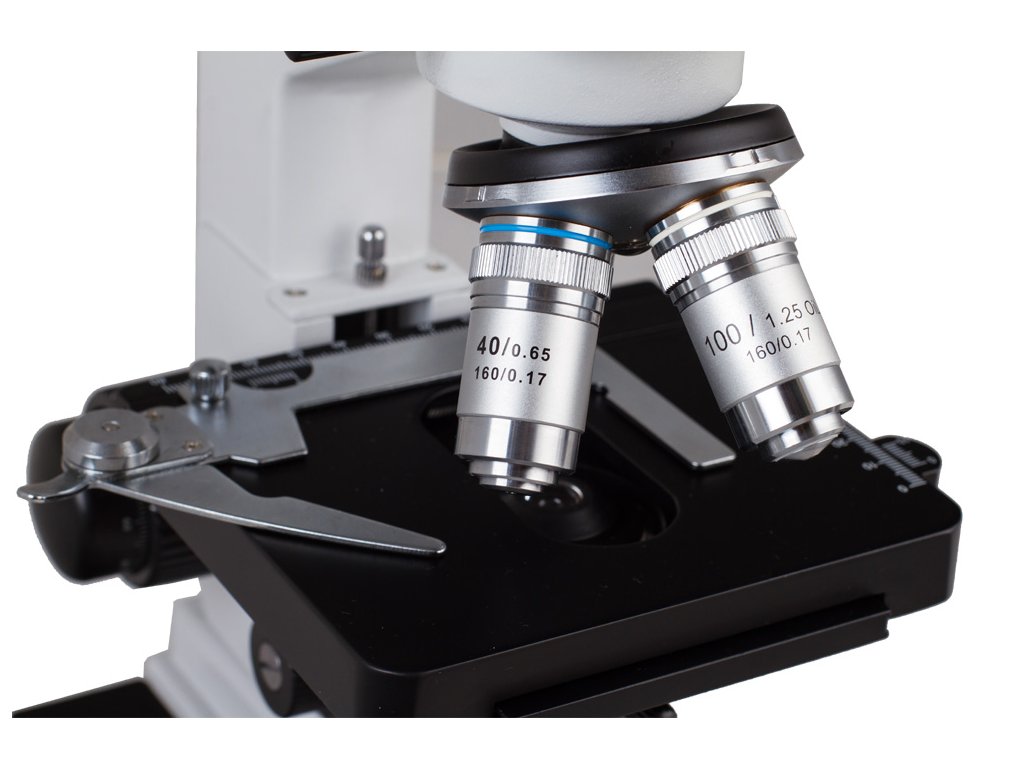 Mikroskop je vybaven pracovním stolkem s posuvným měřítkem, který umožňuje upevnění dvou preparátů najednou, a šrouby hrubého a jemného nastavení zajišťují nejpřesnější možné umístění objektu pod objektivem. Revolverový nosič se čtyřmi objektivy umožňuje získat zvětšení od 40x do 1000x. Díky čočce o zvětšení 100x lze použít olejovou imerzní techniku. Výkonné LED osvětlení vám umožňuje pozorovat preparáty v procházejícím světle. Plynulé nastavení jasu umožňuje Abbeův kondenzor s irisovou clonou. Součástí sady je i modrý filtr.