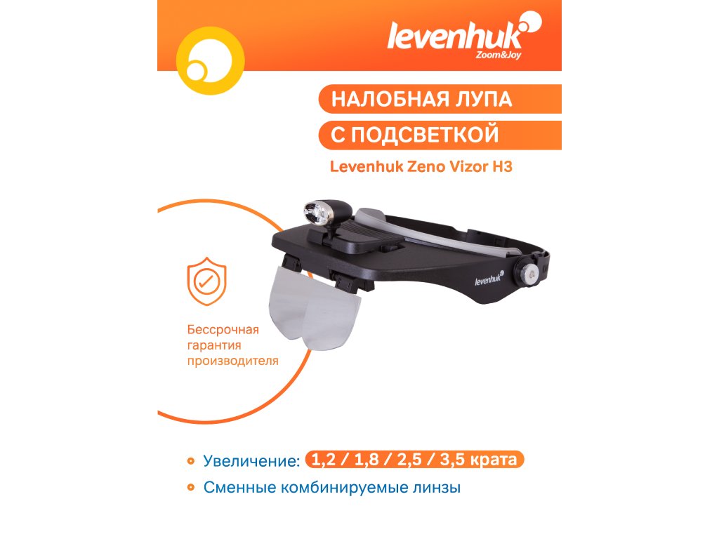 Náhlavní lupa Levenhuk Zeno Vizor H3 má vyměnitelné čočky. Rozsah zvětšení čoček se pohybuje v rozsahu 1,2–3,5x. V případě potřeby lze čočky kombinovat do párů. Lupa je vybavena integrovaným LED osvětlením, které nabízí dostatečný jas k nasvícení pracovní plochy i v úplné tmě.