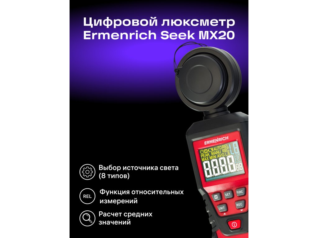 Digitální luxmetr Ermenrich Seek MX20 je určen k měření úrovně osvětlení. Měření je k dispozici v různých jednotkách luxů a stopových kandel. Rozsah měření lze nastavit ručně nebo automaticky, stejně jako zvolit typ světelného zdroje.