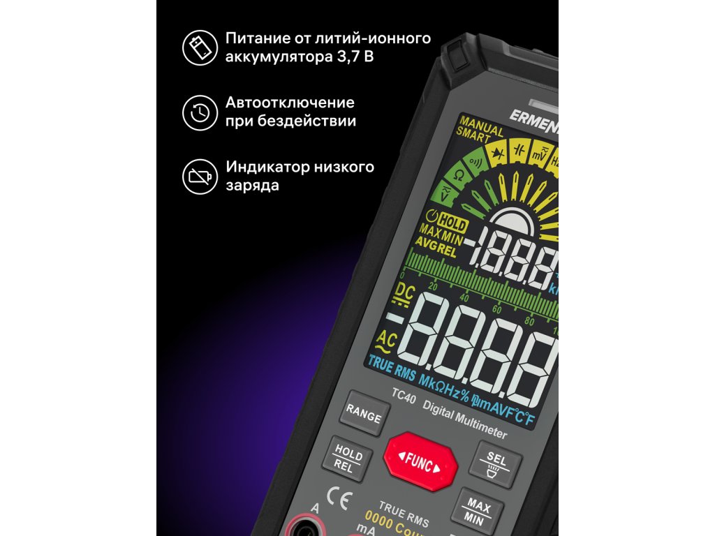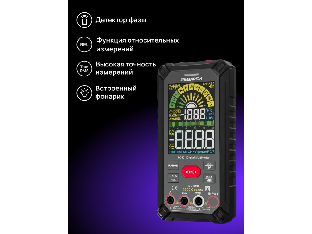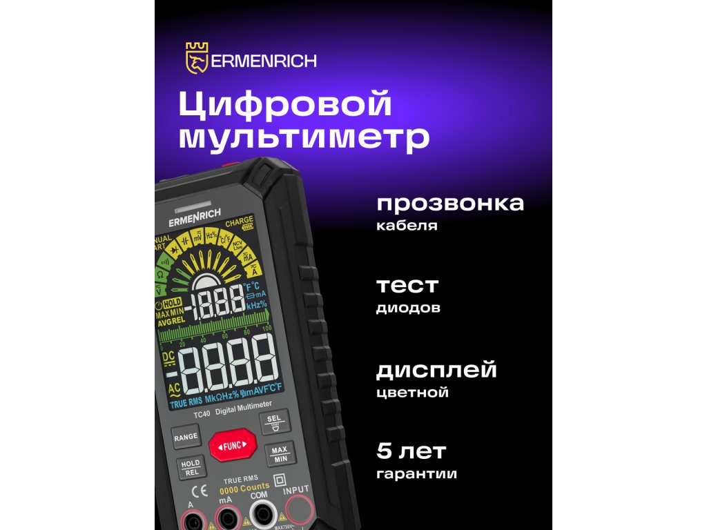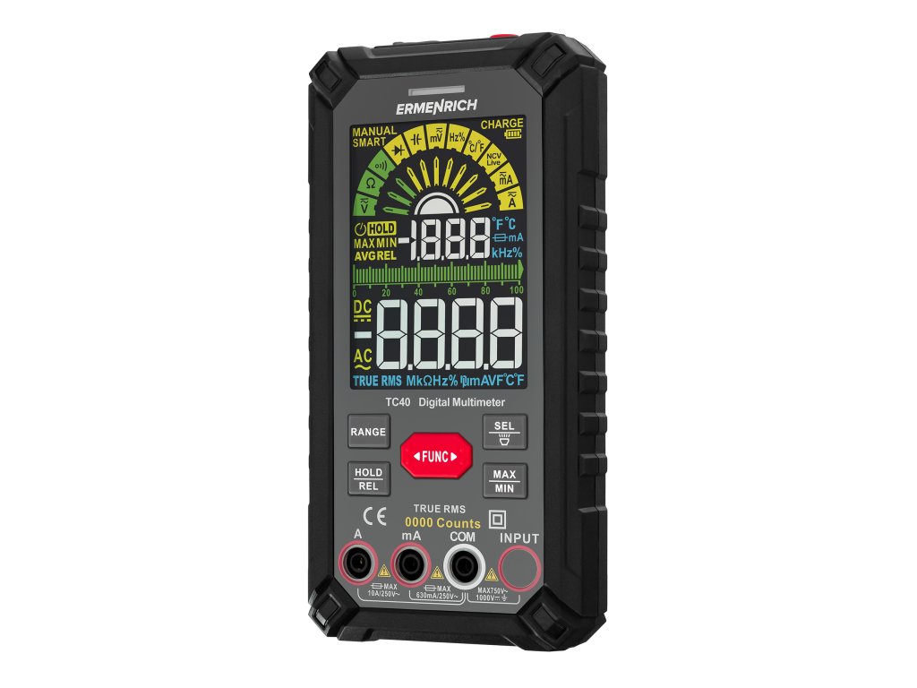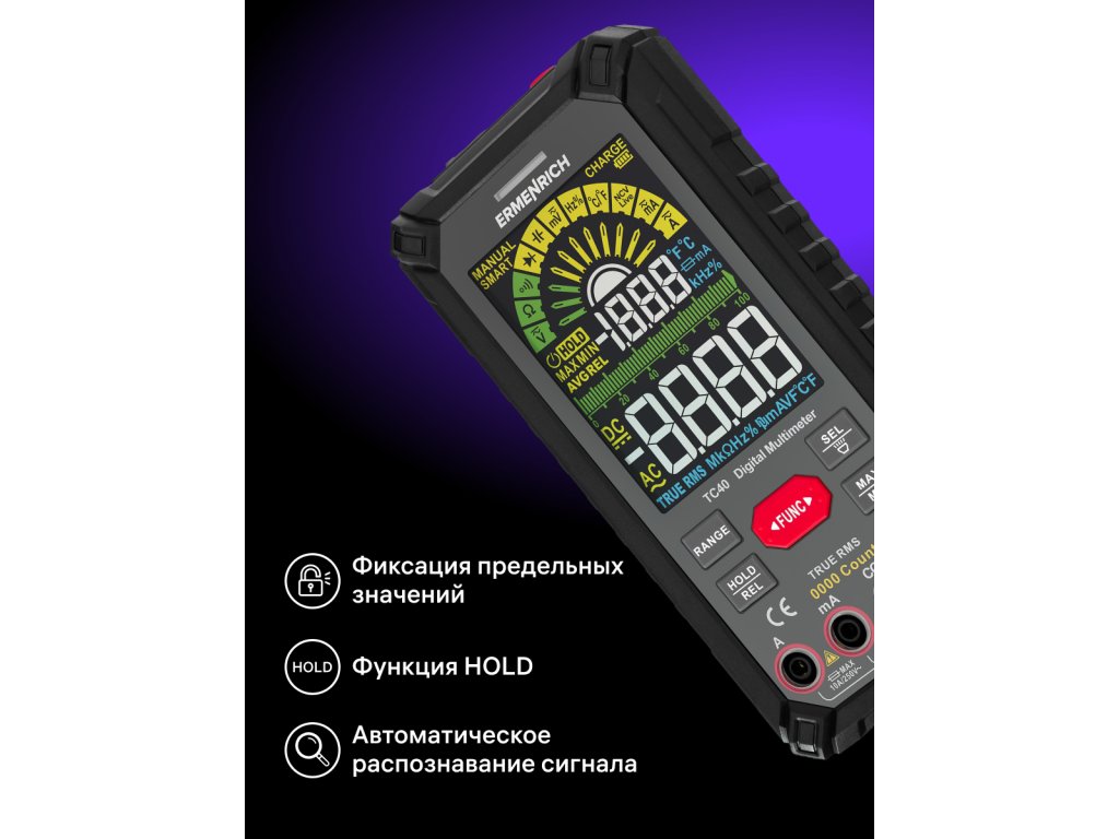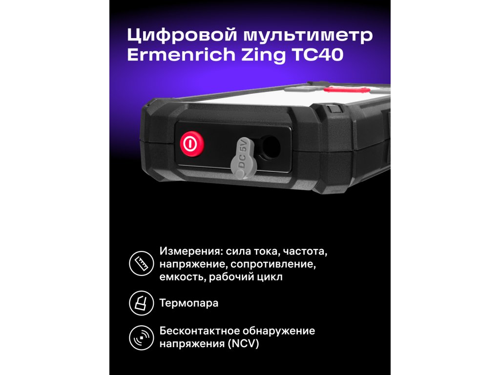 Digitální multimetr Ermenrich Zing TC40 měří následující charakteristiky: proud, napětí, odpor, frekvenci, kapacitu. Disponuje také funkcemi pro měření pracovního cyklu a teploty. Diagnostické funkce zahrnují test diod, test kontinuity, detekci fáze a bezkontaktní detekci vysokého napětí (NCV). Pomocí funkce přidržení zobrazení naměřené hodnoty můžete uchovat naměřené údaje na displeji.