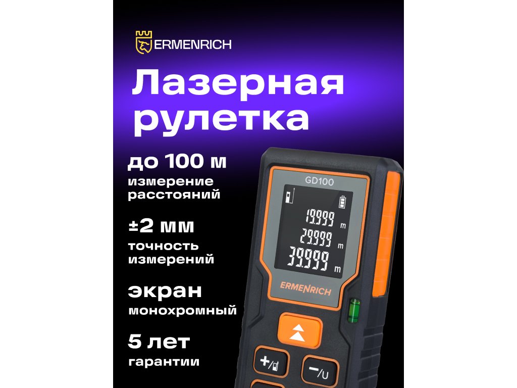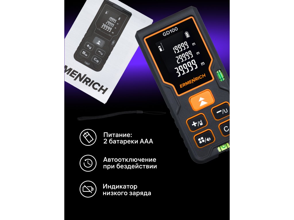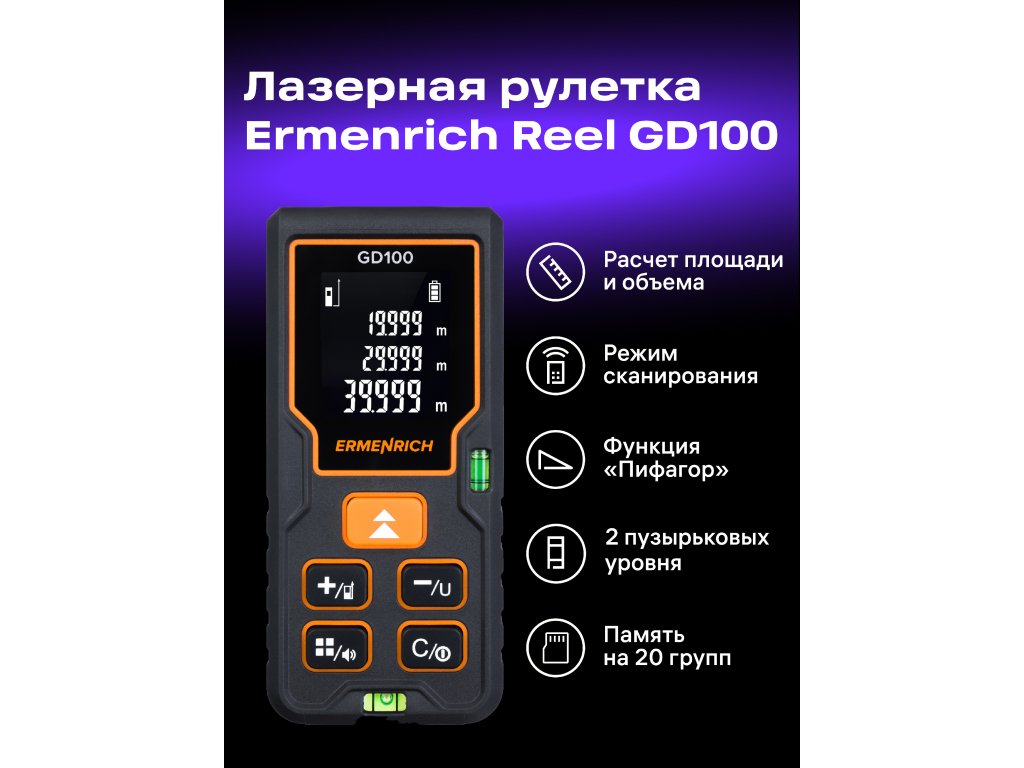 Laserový měřič Ermenrich Reel PLUS GD100 je multifunkční přístroj pro řešení široké škály úkolů v oblasti strojírenství, stavebnictví a renovačních prací. Nejlépe se hodí pro lineární měření a měření plochy a objemu velkých místností – až do 100 metrů na jedné straně. Kromě jednotlivých měření můžete také automaticky skenovat místnost. Údaje se zobrazují na třířádkovém LCD displeji a současně lze uložit až 20 skupin výsledků měření. Je možný provoz bez zvukových upozornění.