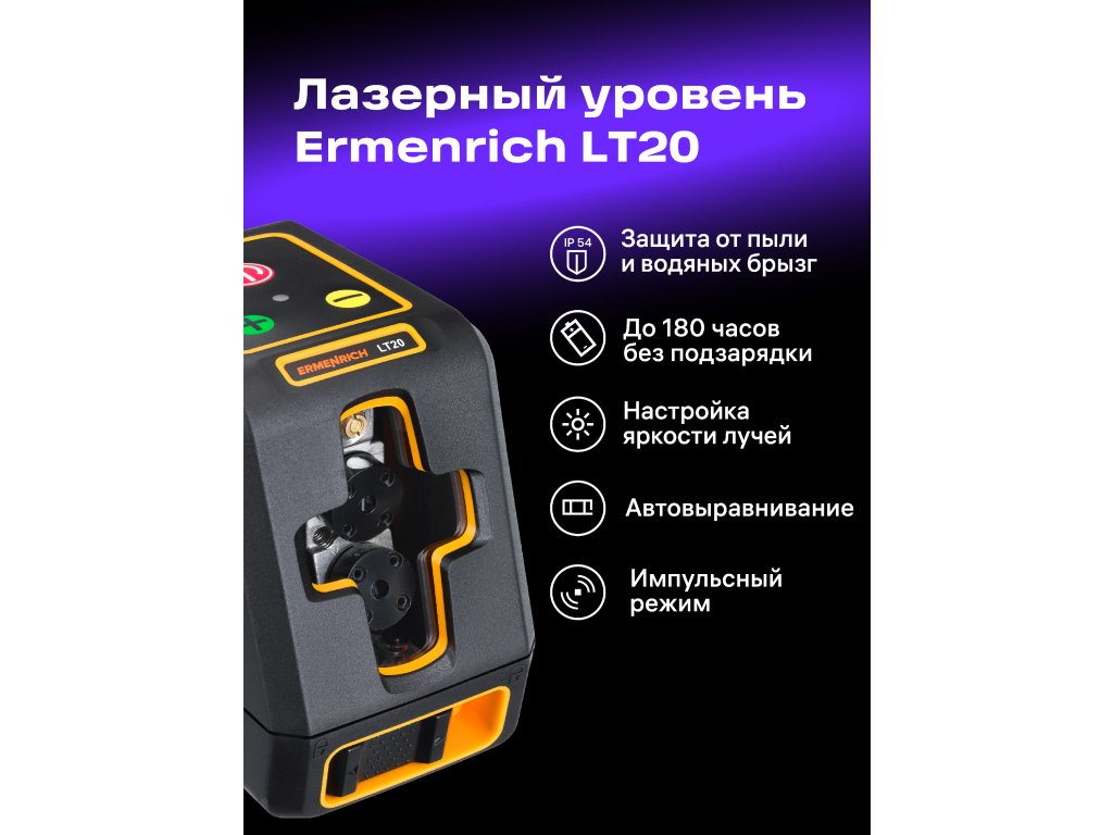 Ermenrich BASE LT20 lze namontovat na vodorovnou plochu nebo namontovat na standardní stativ. Pomocí stativu s naklápěcí hlavou můžete naklonit vodováhu, abyste získali požadovanou konfiguraci laserové linie. Zařízení je odolné proti prachu a postříkání vodou, což je zvláště cenné v prostředí renovace a výstavby. Hladina je napájena standardními bateriemi. K dispozici je 10 úrovní jasu.