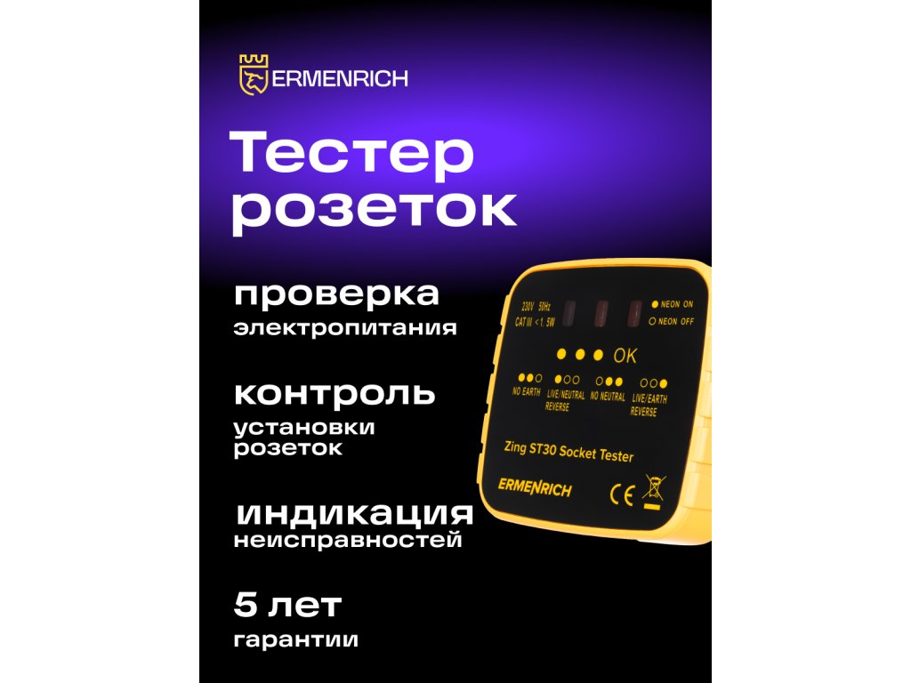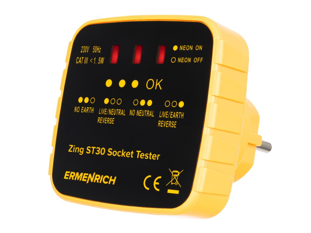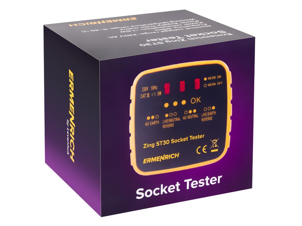 Tester zásuvek Ermenrich Zing ST30 je určen k testování, zda jsou všechny zásuvky správně zapojeny, a ke kontrole napětí. Tester je třeba zapojit přímo do zásuvky a blikání LED kontrolek indikuje různé elektrické závady: chybějící zemnící vodič / chybějící nulový vodič, obrácená polarita fázového a nulového vodiče nebo obrácená polarita fázového a zemnícího vodiče. Kromě toho specifický barevný kód, který se zobrazí na displeji testeru, signalizuje správný stav zapojení. Funkce každého kódu je napsána na přístroji.
