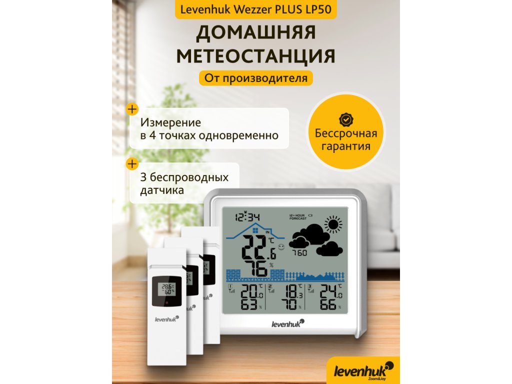 Levenhuk Wezzer PLUS LP50 – vícekanálová meteorologická stanice, která měří teplotu a vlhkost na čtyřech místech najednou. Základnová stanice je vybavena třemi senzory dálkového ovládání, které lze umístit v různých místnostech nebo venku. Meteorologická stanice se osvědčí na venkově, kde je nezbytné kontrolovat meteorologické údaje v místech skladování úrody a v hospodářských budovách. Hodí se také v prostorném bytě nebo kanceláři.