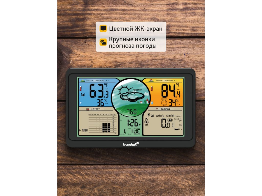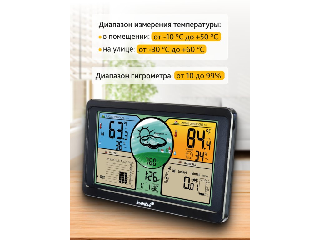 Meteorologická stanice Levenhuk Wezzer PLUS LP70 je multifunkční zařízení, které poskytuje podrobné informace o počasí. Senzor dálkového ovládání detekuje teplotu, vlhkost a množství srážek ve venkovním prostředí. Naměřené hodnoty přenáší do základnové stanice, která provádí měření v interiéru, například zaznamenává teplotu a úroveň vlhkosti v místnosti. Přístroj obsahuje barometr a poskytuje meteorologickou předpověď, indikátor trendů zobrazuje změny parametrů a obecné hodnocení komfortu pro člověka. Stanice je navržena tak, aby vás informovala o rychlých změnách počasí a stavu mikroklimatu v domácnosti.