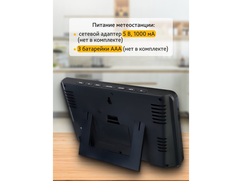 Meteorologická stanice je napájena bateriemi nebo ze sítě. Pokud je přístroj napájen ze sítě, je k dispozici nepřetržité podsvícení obrazovky. V tomto režimu může přístroj snadno nahradit stolní hodiny.