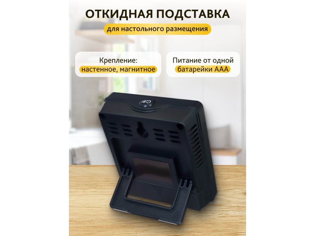 Přístroj Levenhuk Wezzer L10 funguje na baterie a nevyžaduje připojení k síťovému napájení. Přístroj můžete umístit na stůl pomocí rozkládacího stolního stojanu nebo jej zavěsit na stěnu. K dispozici je také magnetická zadní strana: termohygrometr můžete umístit na lednici. Kromě hodnot teploty a vlhkosti se na obrazovce zobrazuje také indikátor komfortu. V závislosti na úrovni vlhkosti se na obrazovce zobrazuje údaj „LOW“ (nízká, 10–39%), „OK“ (komfortní, 40–75%) nebo „HIGH“ (vysoká, 76–99%).