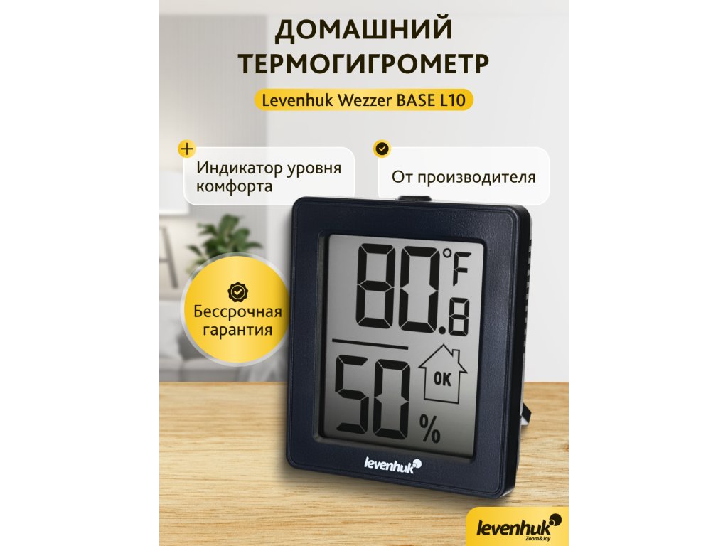 Termohygrometr Levenhuk Wezzer BASE L10 je malý přístroj, který vám pomůže kontrolovat teplotu a úroveň vlhkosti vzduchu v místnosti. Je užitečný v bytě, kanceláři, ve venkovském domě, nebo při cestování. Přístroj nemá více dalších funkcí – je to vynikající základní model pro sledování klíčových parametrů mikroklimatu. Můžete sledovat změny teploty a zabránit tvorbě plísní nebo naopak zabránit nadměrně suchému vzduchu.