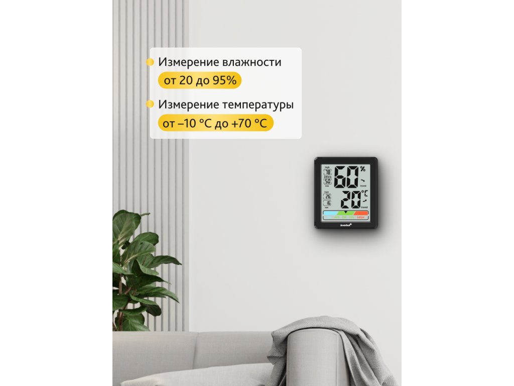 Termohygrometr Levenhuk Wezzer BASE L20 je kompaktní přístroj pro montáž na stěnu. Měří teplotu a vlhkost vzduchu v místnosti a zaznamenává nejvyšší a nejnižší hodnoty. Zobrazuje také trendy, které indikují změny parametrů počasí. Poskytuje tak vynikající možnost sledovat změny mikroklimatu v ložnici, dětském pokoji, kancelářské místnosti nebo venkovském domě.