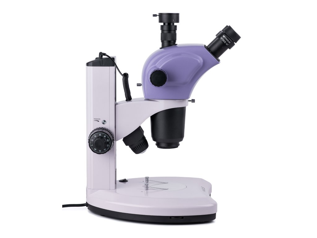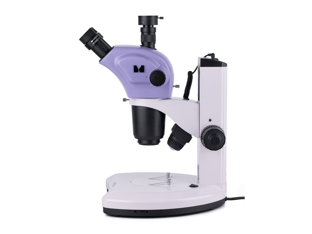 Mikroskop má trinokulární hlavu s trinokulárním tubusem pro montáž fotoaparátu. Adaptér typu C-mount je součástí dodávky, ale digitální fotoaparát je nutné zakoupit samostatně. Trinokulární hlava se otáčí o 360°. Objektiv se zoomem v kombinaci s 10x okulárem umožňuje zvětšení od 7x do 63x. Díky objektivu se zoomem se zvětšení mění bez snížení zaostření. Pokud používáte pomocné objektivy (nejsou součástí dodávky), můžete změnit rozsah zvětšení, pracovní vzdálenost a zorné pole mikroskopu. S volitelným příslušenstvím lze zvětšení mikroskopu zvýšit až na 315x.