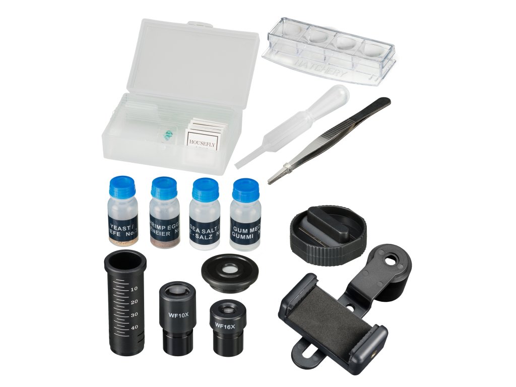 The power supply is provided by batteries (three times type AA), so that microscopic work can also be carried out in the vicinity without a socket. The accessories already include permanent specimens and 5 empty slides and cover glasses for making your own specimens. The set also includes a preparation set consisting of a MicroCut, a knife, tweezers, a rod and a tube.
